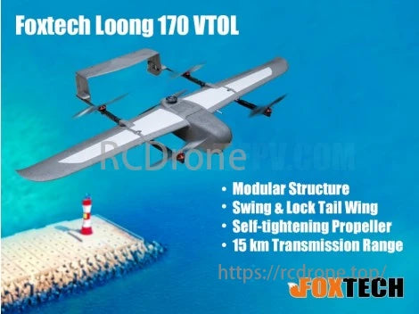 Fly with Foxtech Loong 170 VTOL, featuring a 1700mm wingspan, cruising speed of 16-26m/s, and max takeoff weight of 4.5kg; suitable for indoor or outdoor use.
