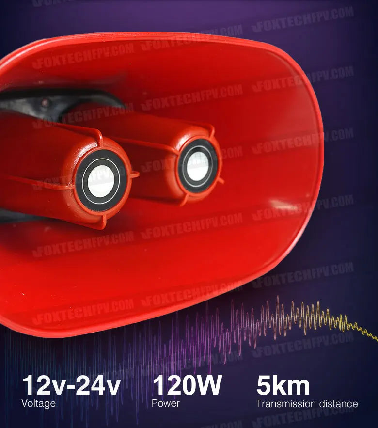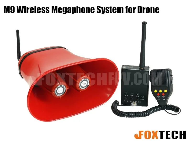 The Foxtech M9 drone speaker features a wireless megaphone system with a powerful 15km range, 120W output, and 15dB loudspeaker.