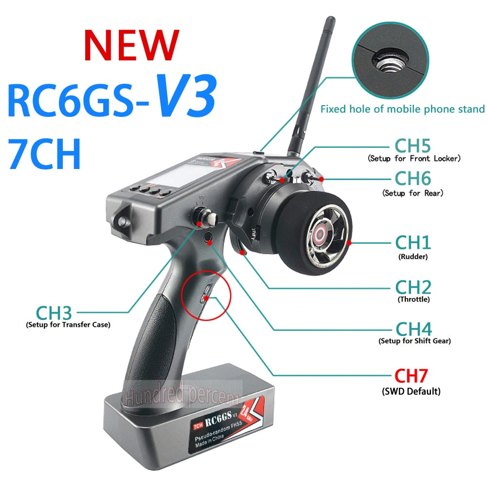 The new RC6GS-V3 features a fixed hole on its mobile phone stand, which includes six channels: Channel 1 (Rudder), Channel 2 (Throttle), Channel B (Setup for Shift Gear), Channel Z (100 percent default setting), and Setup for Front Locker.