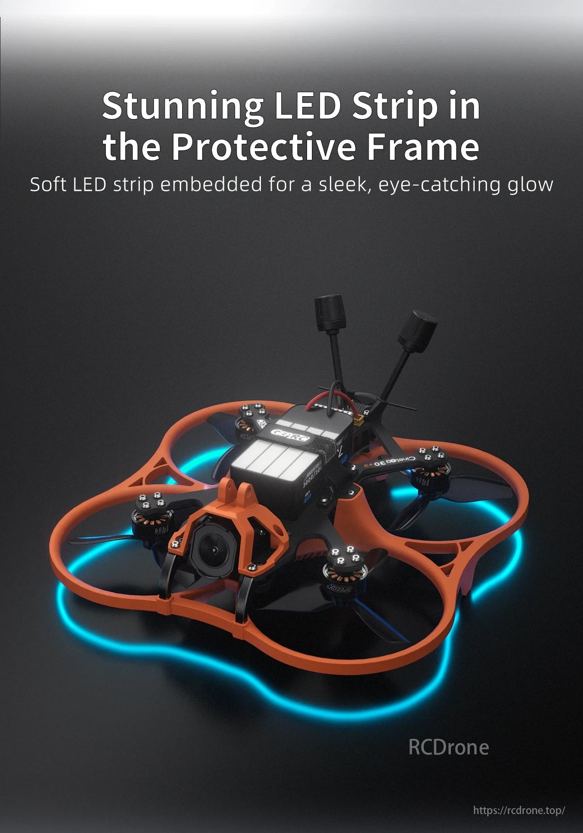 The frame is reinforced with aluminum for added strength, while the electronic compartment is designed with a wrap-around structure to protect internal components better. Dust-proof plugs safeguard the data ports, and the canopy shields the camera from impacts. The rear PDB promotes clean wiring and an efficient layout.