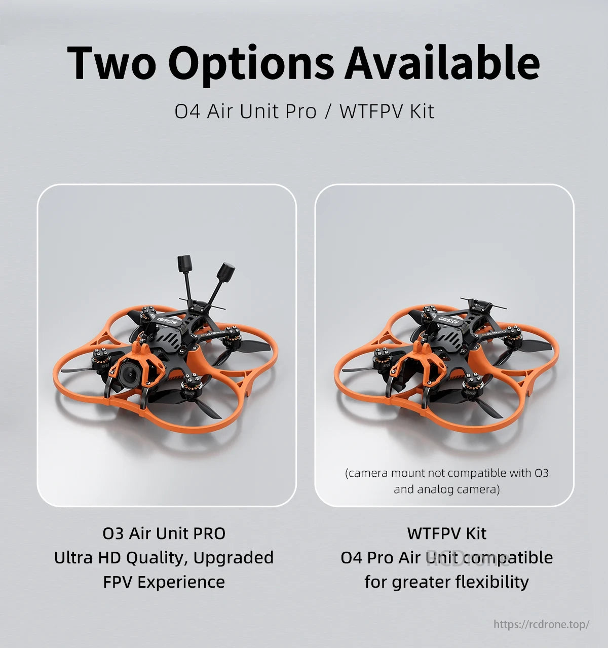 Two options: O3 Air Unit Pro offers Ultra HD, upgraded FPV; WTFPV Kit provides O4 Pro compatibility for greater flexibility.