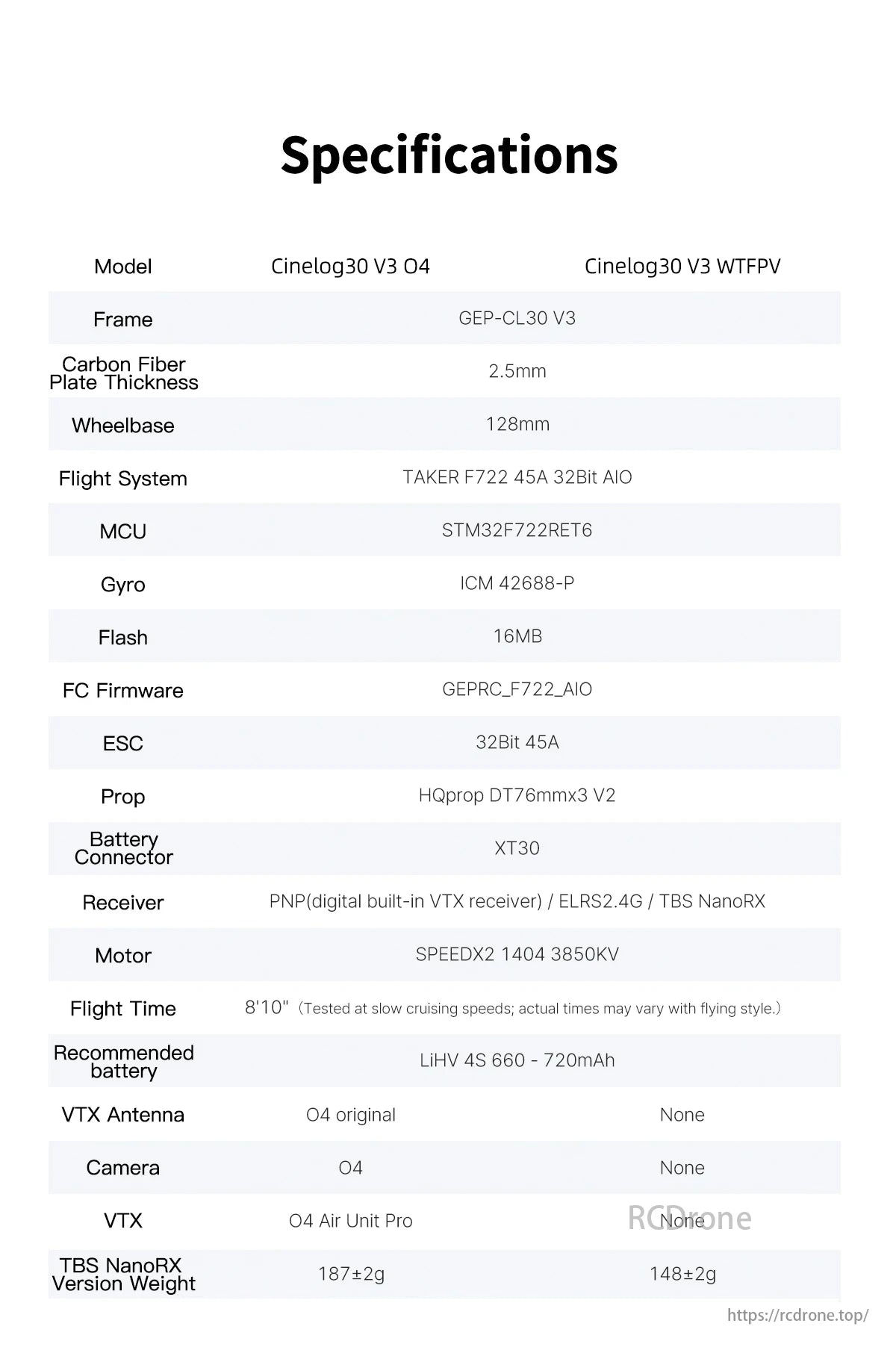 Specifications for Cinelog30 V3 models include a 2.5mm carbon fiber plate, 128mm wheelbase, TAKER F722 flight system, STM32F722RET6 MCU, and ICM 42688-P gyro. Features vary between O4 and WTFPV versions, with the O4 including an original VTX antenna, camera, and Air Unit Pro VTX. Flight time is 8-10 minutes.