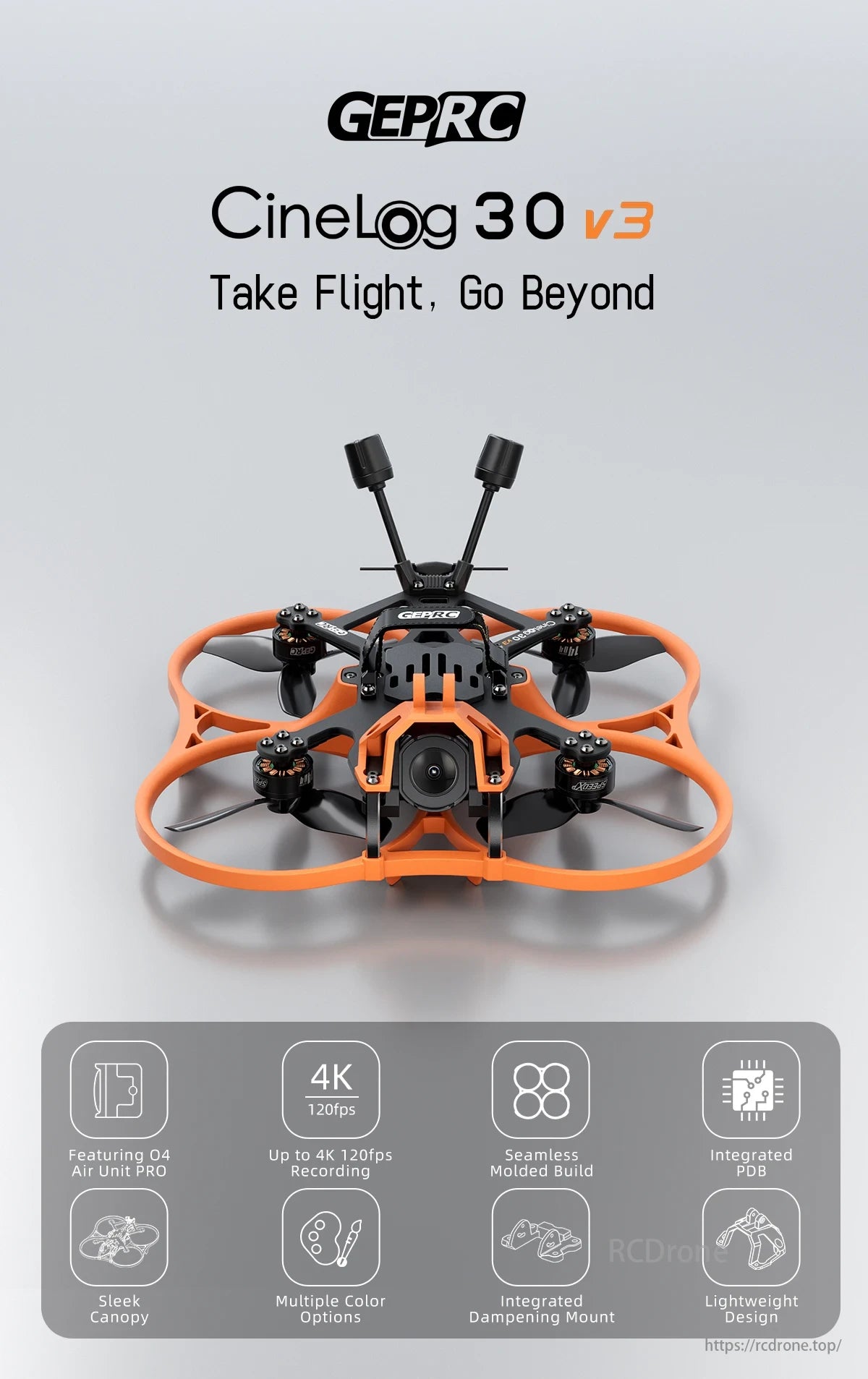 GEPRC CineLog 30 v3. Take Flight, Go Beyond. Features include 4K 120fps recording, seamless molded build, integrated PDB, sleek canopy, multiple color options, and lightweight design.
