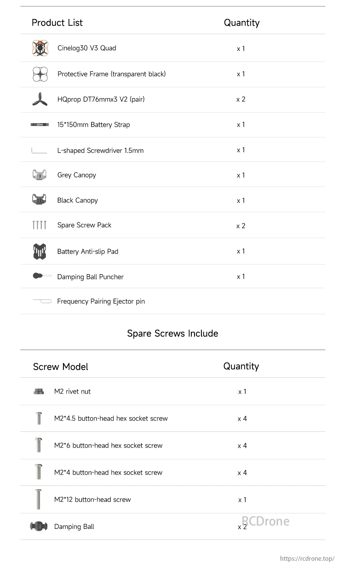 Product list includes drone, propellers, landing gear, screws, and accessories. Actual product varies by version.