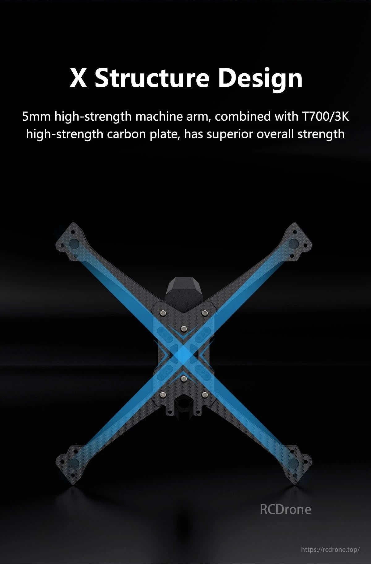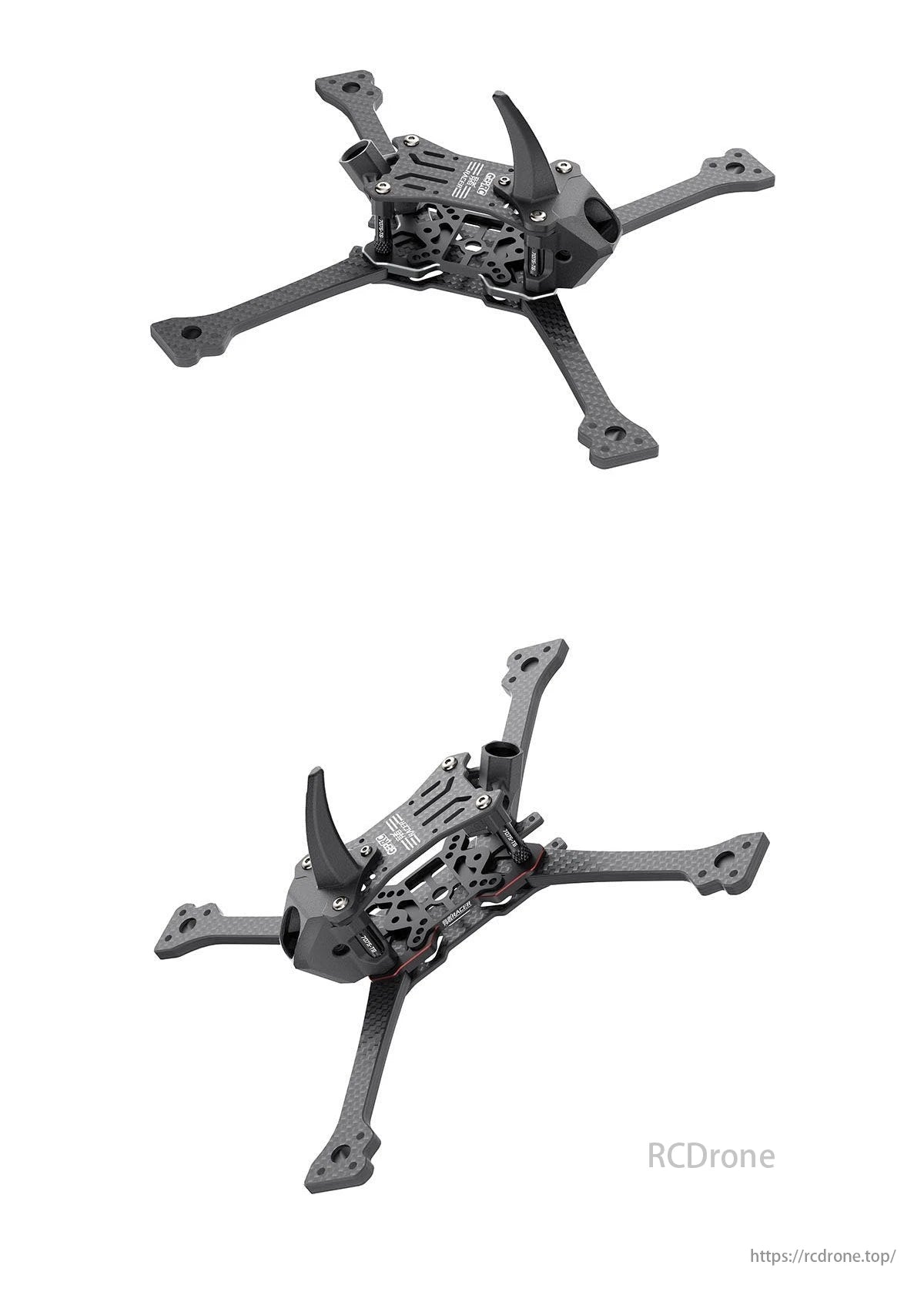 The Racer frame combines the 7075-T6 aviation aluminum alloy splint and the high-grade T700 carbon plate CNC processing, and the overall structure is solid. 20*20mm/25.5*25.5mm/30.5*30.5mm flight controller can be installed, and the motor mounting hole is 16*16mm.