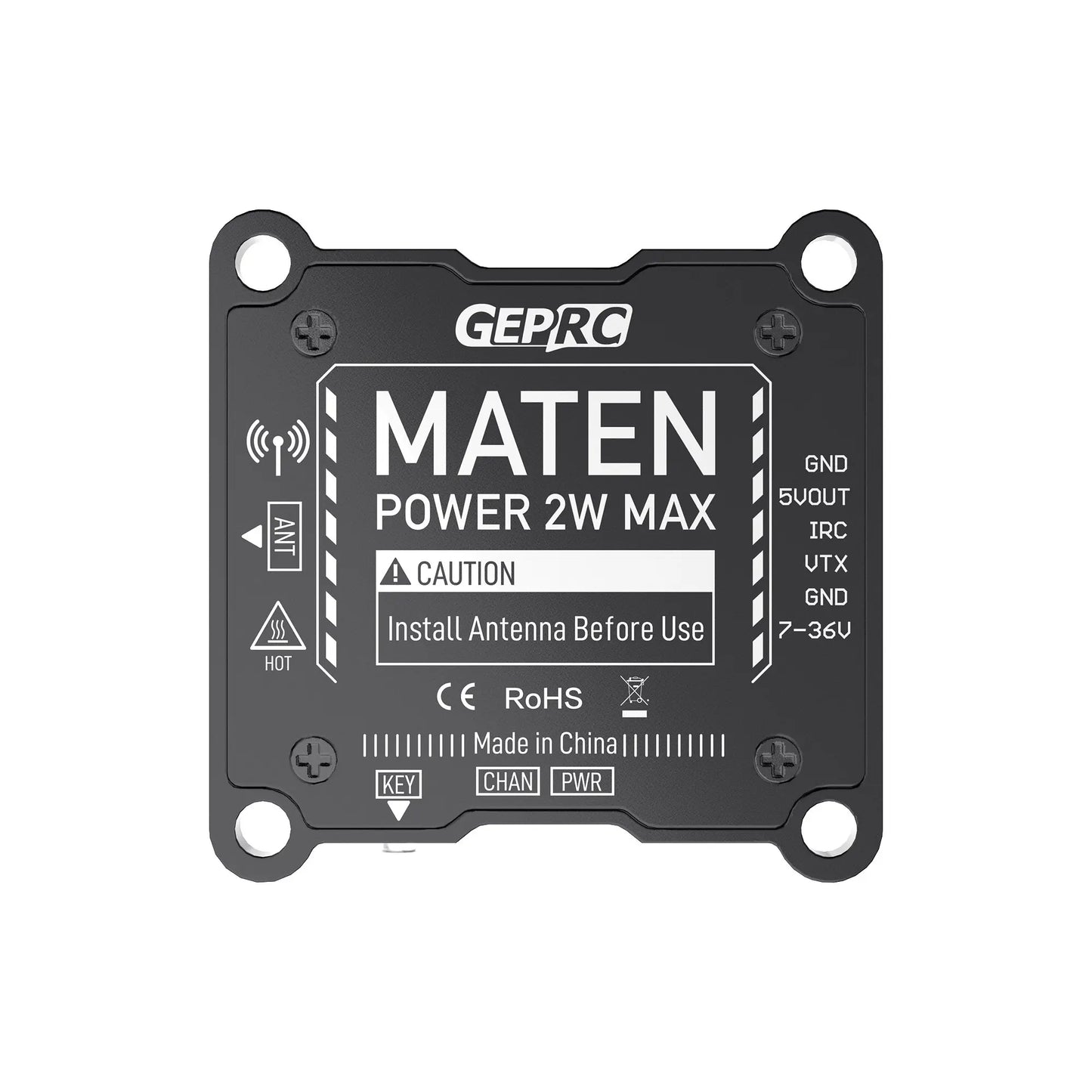 Important Safety Information: GEPRC MATEN 1.2G 2W VTX Maximum Power Output Warning: IRC CAUTION. Install antenna before use. Operating voltage range: 7-36V. Made in China, RoHS compliant. (Note: Key L Chani Pwr)