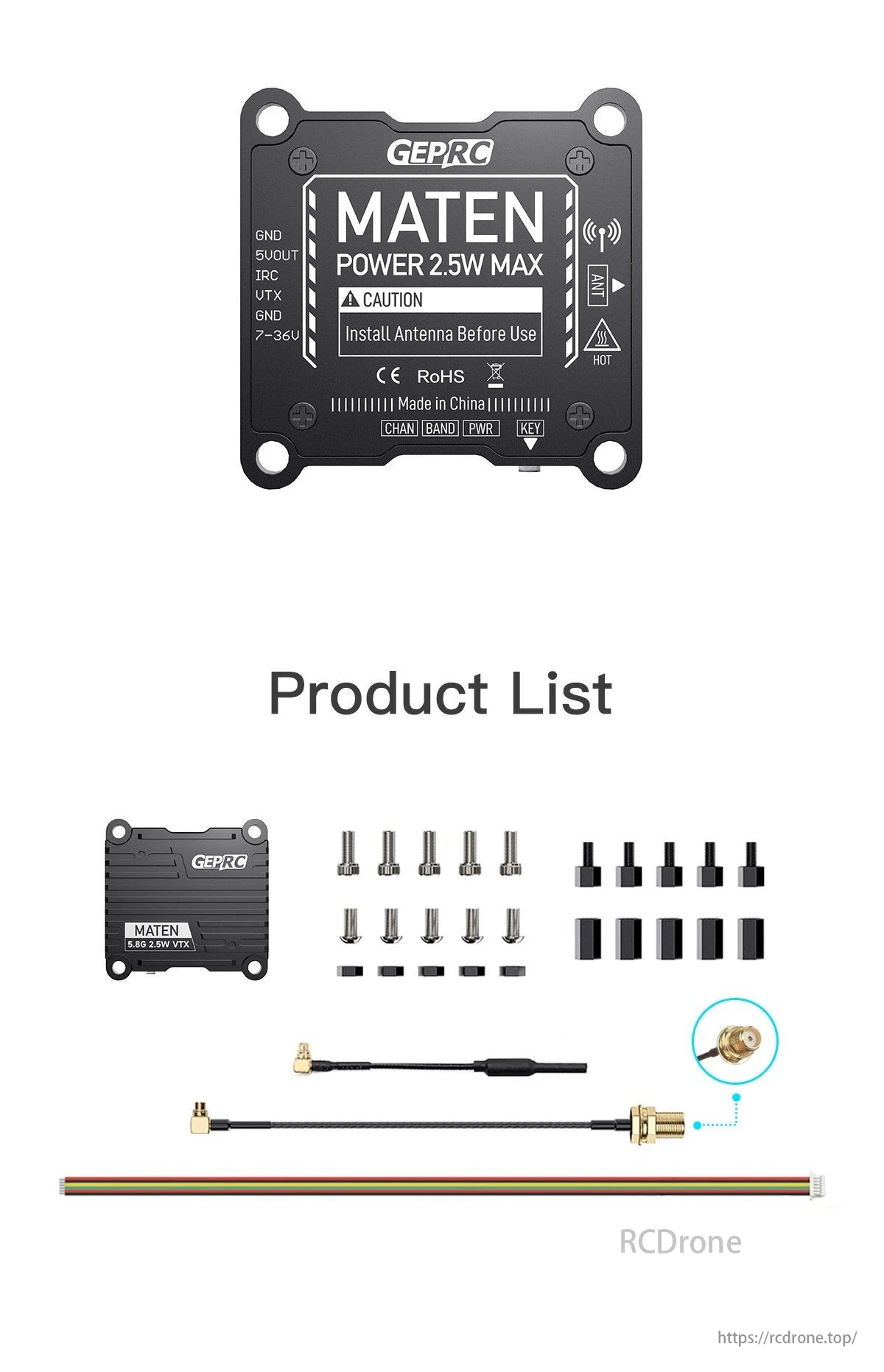 MATEN 5.8G 2.5W VTX product list includes main unit, screws, rubber pads, antenna cable, power cable. Install antenna before use. Made in China.