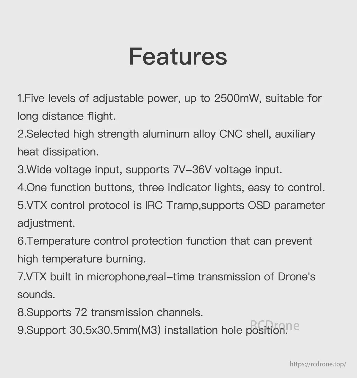 This product features five adjustable power levels up to 2500mW, ideal for long-distance flights. The aluminum alloy CNC shell provides effective heat dissipation. It has a wide voltage input range of 7V-36V and one function button with three indicator lights for easy control. The VTX uses IRC Tramp protocol and supports OSD parameter adjustment. Temperature protection prevents high temperatures from causing damage. A built-in microphone transmits real-time audio. It supports 72 transmission channels and has a 30.5x30.5mm M3 installation hole position.