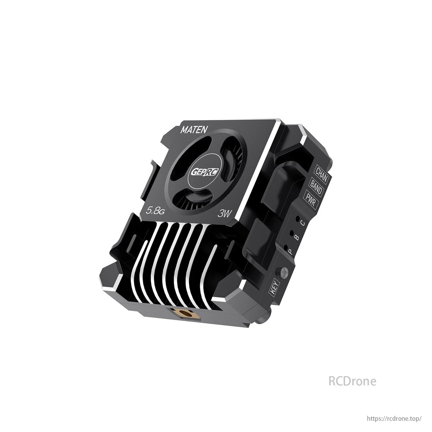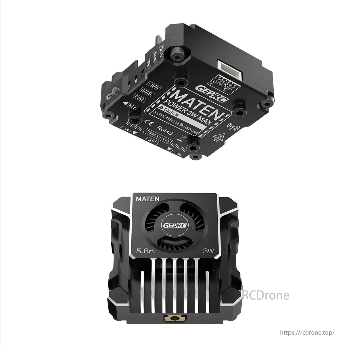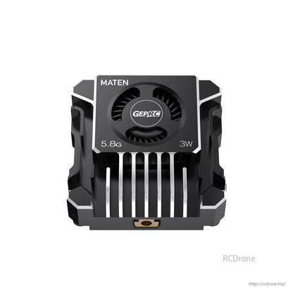 GEPRC MATEN 5.8G 3W VTX, black design with cooling fan, power max 3W, caution for antenna installation before use.