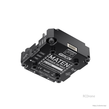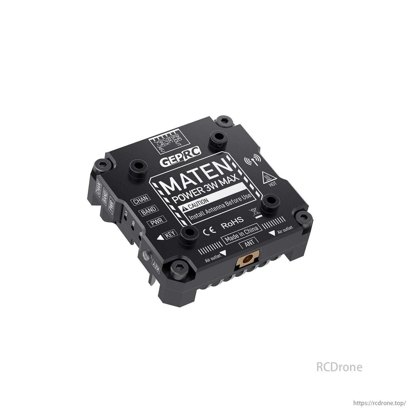 GEPRC MATEN 5.8G 3W VTX, dual-core design, power max 3W, caution for antenna installation before use, made in China, RoHS compliant.
