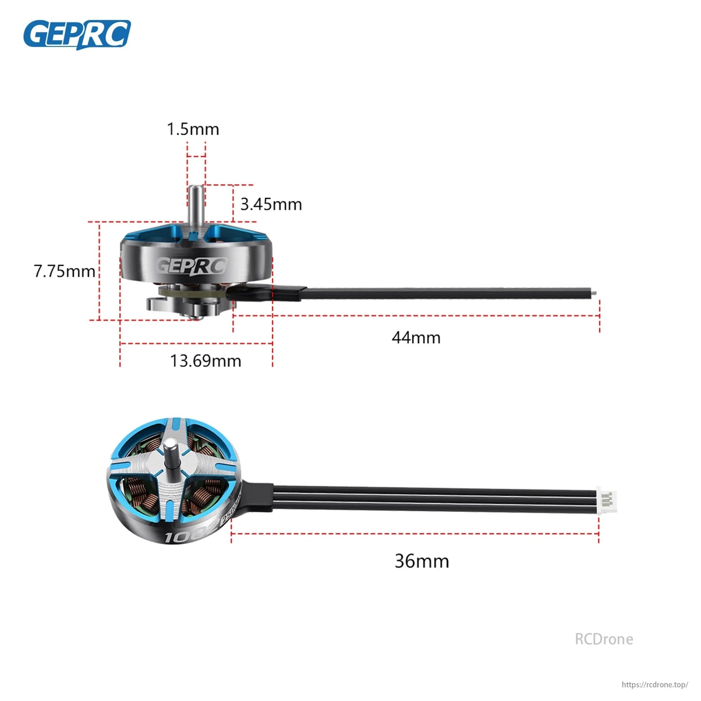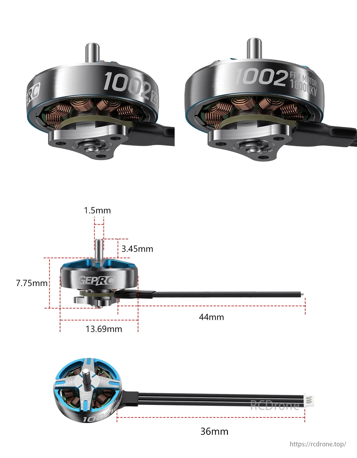 Speedx2 Brushless FPV Motor 1002, 18000KV, dimensions: 7.75mm, 36mm, 44mm.
