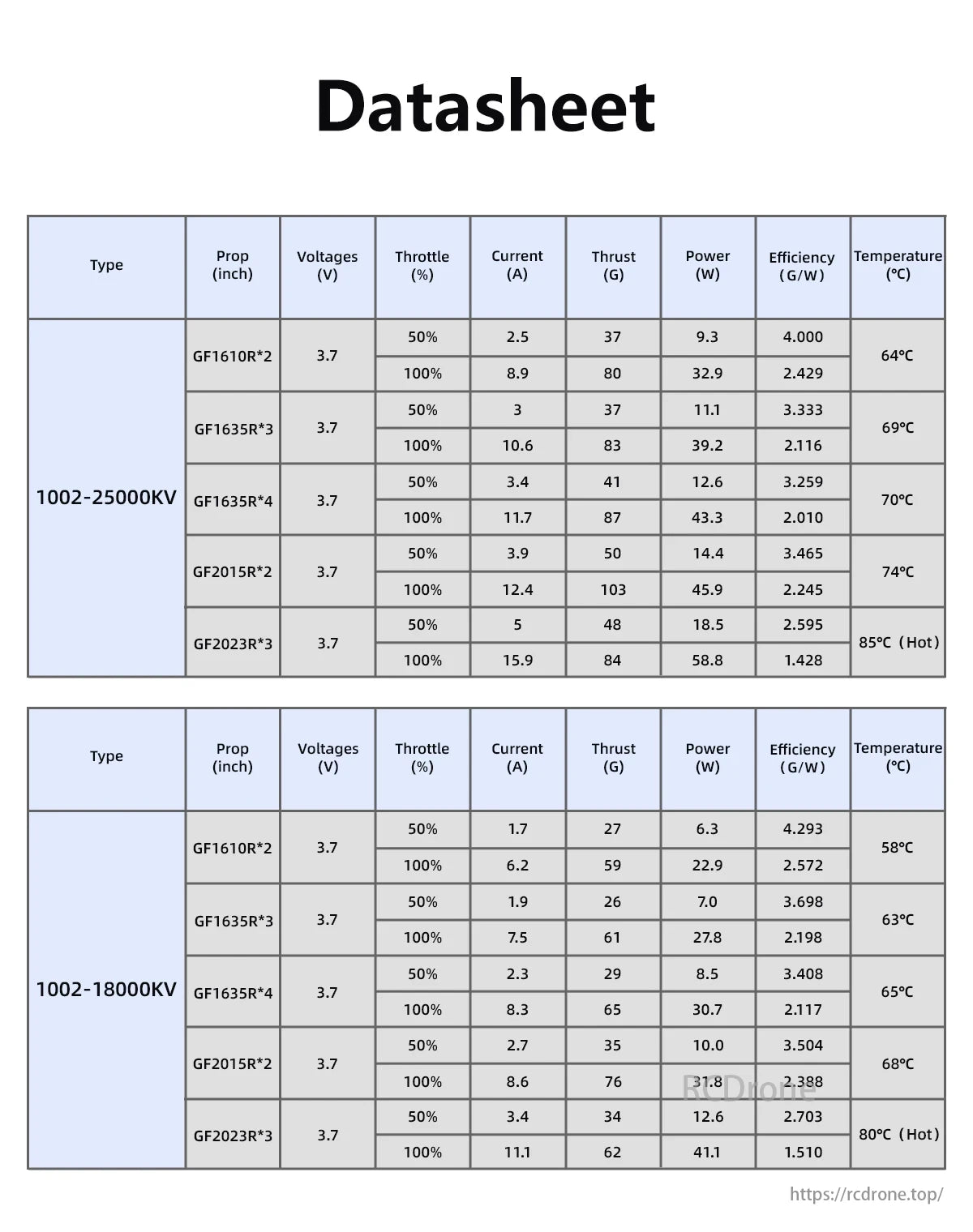 Speedx2 Brushless FPV Motor datasheet. Specs for 1002-25000KV and 1002-18000KV types include prop size, voltage, throttle, current, thrust, power, efficiency, and temperature under various conditions.