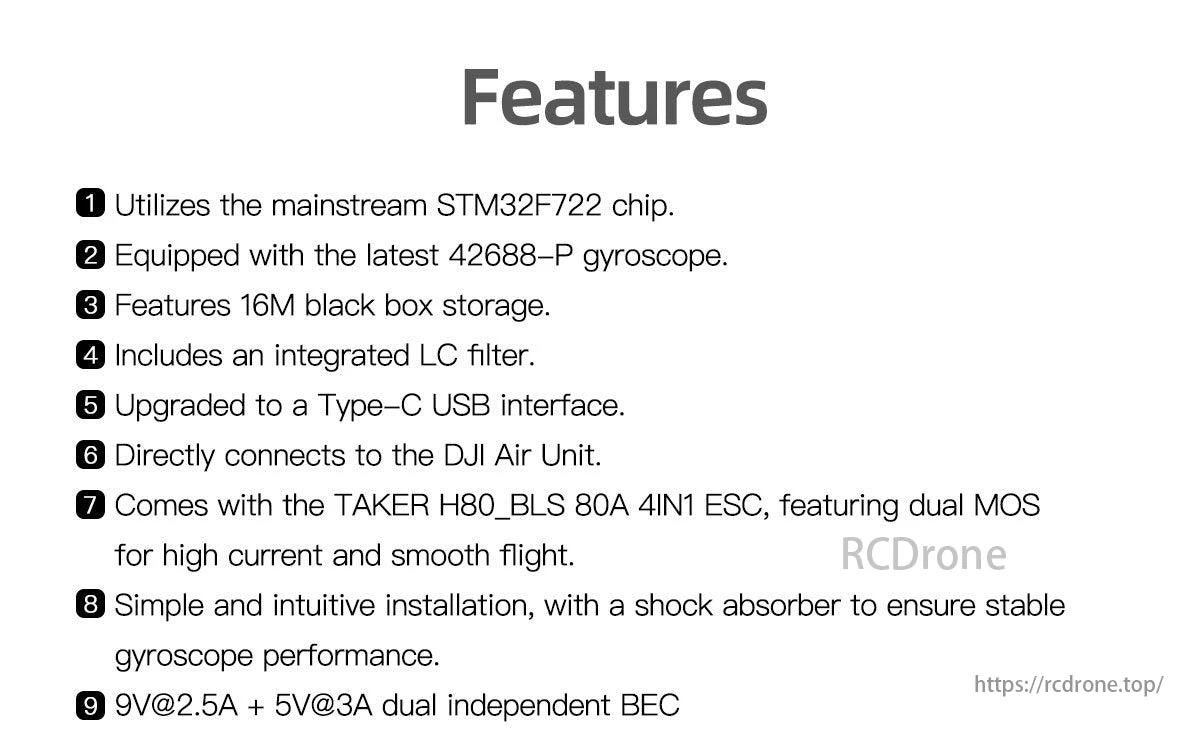 The product features the popular STM32F722 chip. It comes with a recent 42688-P gyroscope, 16M black box storage, and an integrated LC filter. A Type-C USB interface has been added for improved connectivity. The DJI Air Unit can be directly connected to this device. It includes a TAKER H8O_BLS 8OA 4INI ESC with dual MOSFETs for high current and smooth flight.