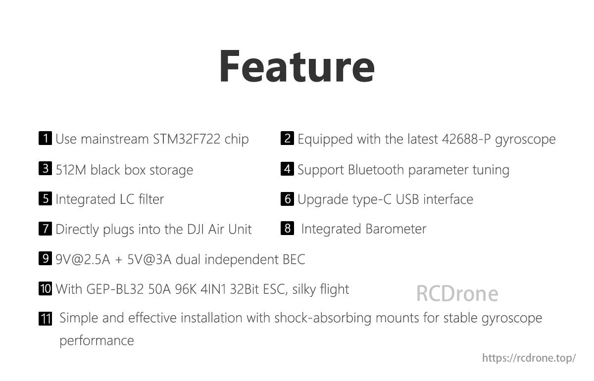 The product features a mainstream STM32F72Z chip, equipped with the latest 42688-P gyroscope, 512M black box storage, and supports Bluetooth parameter tuning. It has an integrated LC filter, type-C USB interface, and directly plugs into the DJI Air Unit. The product also includes an integrated barometer, 9V@2.5A and 5V@3A dual independent BEC, and a GEP-BL32 50A 96K 4INI 32-bit ESC for silky flight.