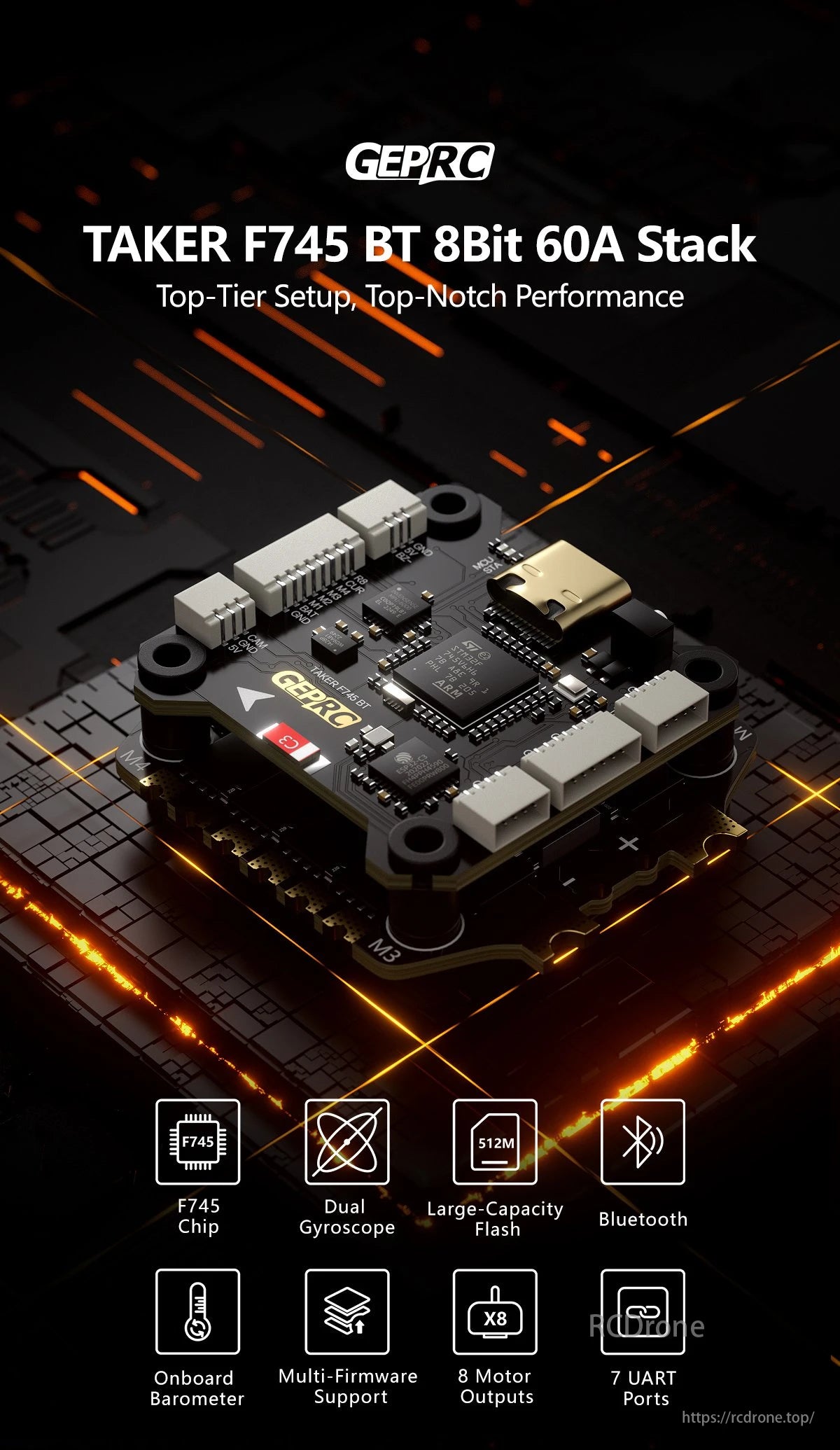 The GEPRC TAKER F745 BT 60A Flight Controller Stack is engineered for demanding applications such as racing, freestyle, and long-range FPV drone builds. It features a STM32F745VGH6 MCU with a Cortex-M7 core running at 216MHz, delivering fast and accurate flight control performance.