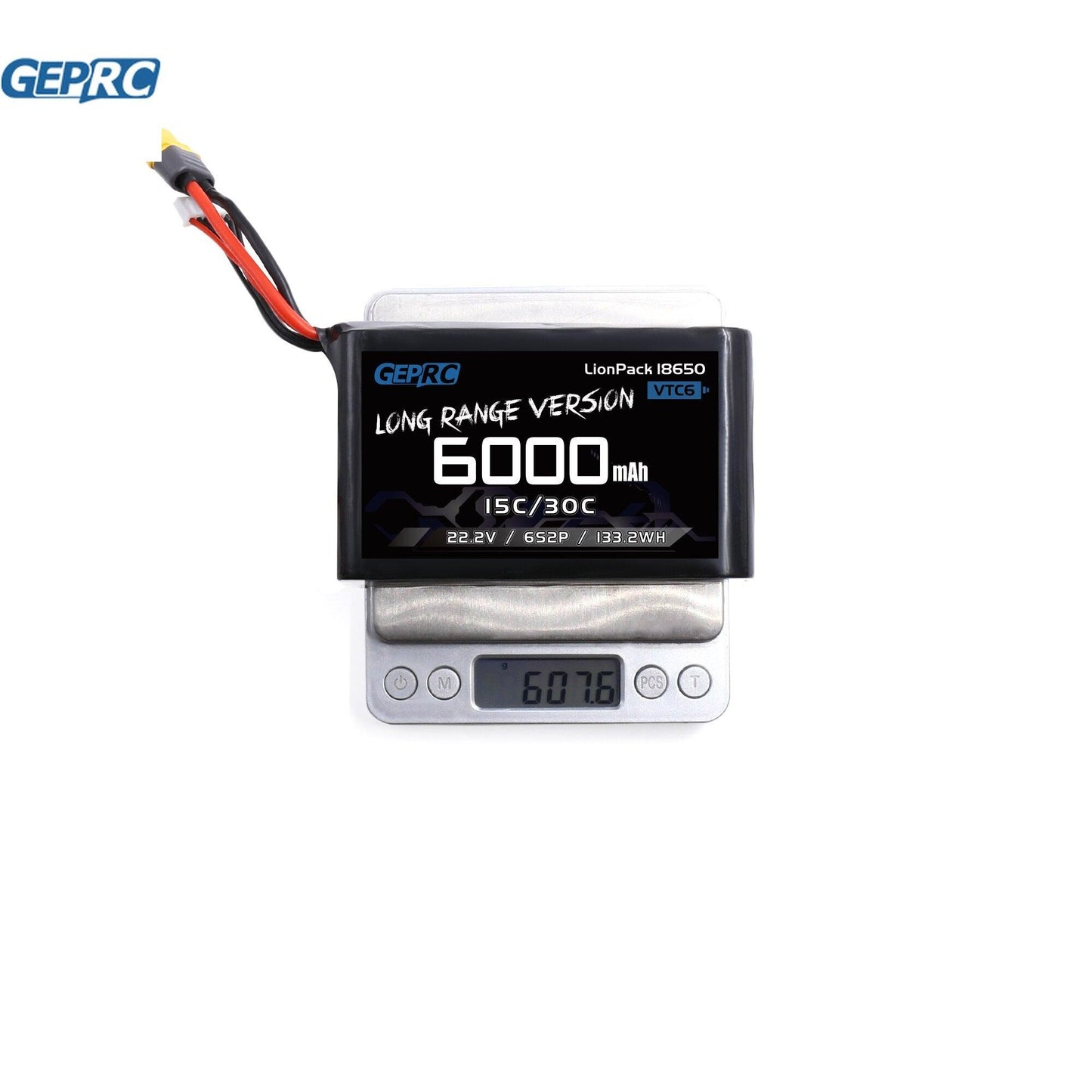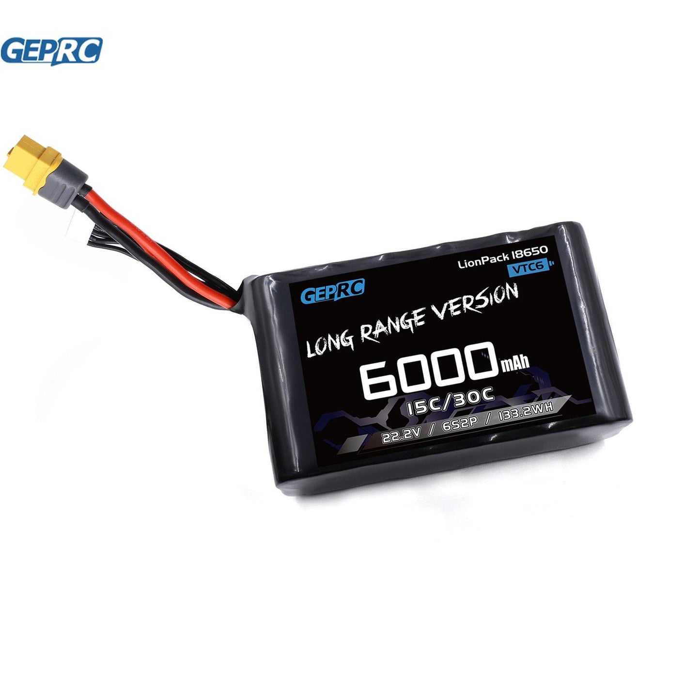 GEPRC's LionPack VTC6 18650 battery features a Long Range Version with 6000mAh capacity, Isc/3oc rating, voltage of 22.2V, and 133.2Wh energy density in a compact 68.76mm package.