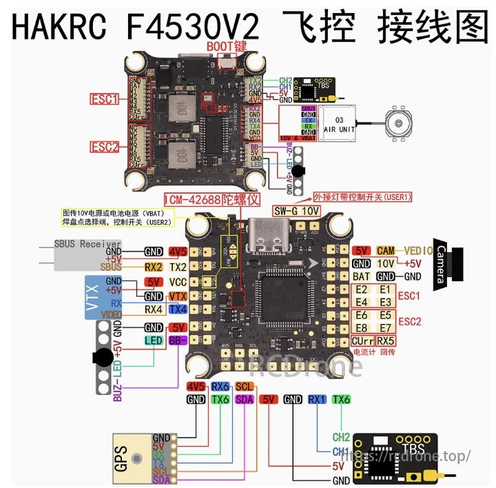Hakrc F4530V2 flight controller wiring diagram. Includes ESC, GPS, camera, SBUS receiver connections. Detailed pinout for boot button, power, and various modules. Essential for FPV drone setup.