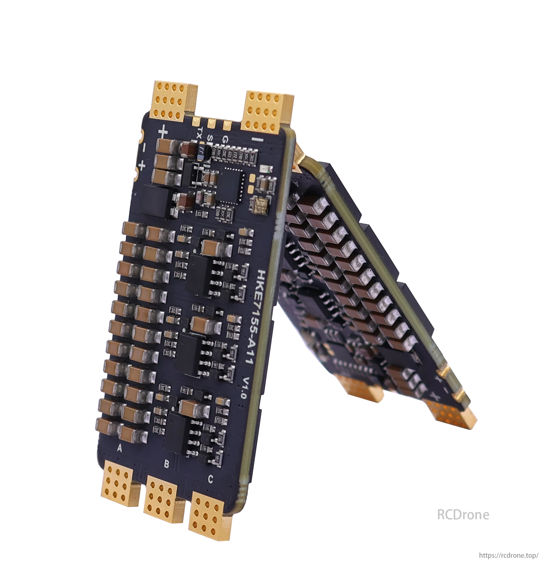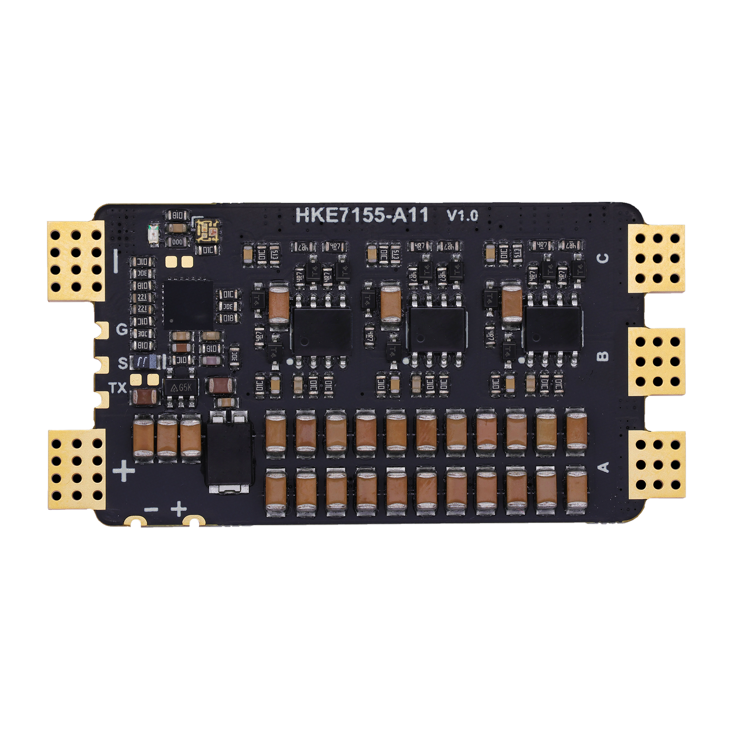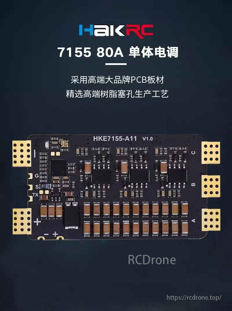HAKRC 7155 80A Drone ESC uses high-end PCB materials and advanced resin-filled hole technology. Model HKE7155-A11 V1.0 ensures robust design for optimal performance.