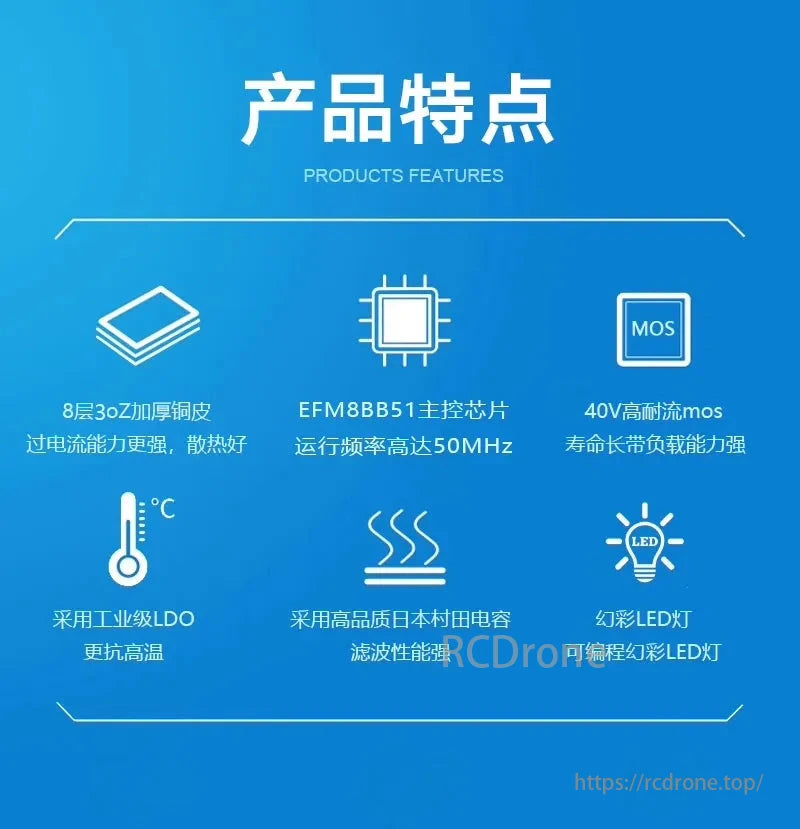 8-layer 3oz thick copper improves current handling and heat dissipation. The EFM8BB51 control chip operates at 50MHz. 40V high-current MOSFETs ensure longevity and strong load capacity. An industrial-grade LDO enhances high-temperature resistance. High-quality Murata capacitors provide superior filtering. Programmable RGB LED lights add versatility. These features make the HAKRC BLS 5139 110A 4-in-1 Drone ESC reliable and efficient for drone use.