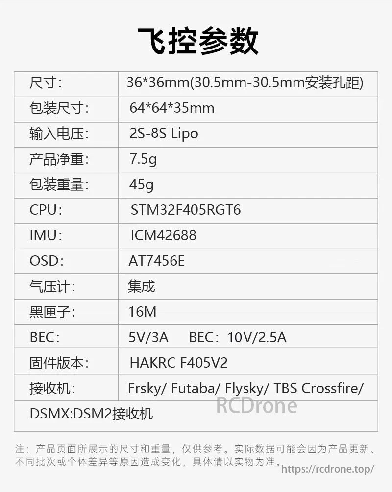 F405 Lite Flight Controller: 36x36mm, 7.5g, 2S-8S Lipo, STM32F405RGT6 CPU, ICM42688 IMU, AT7456E OSD, integrated barometer, 16M black box, 5V/3A & 10V/2.5A BEC, HAKRC F405V2 firmware, supports various receivers.