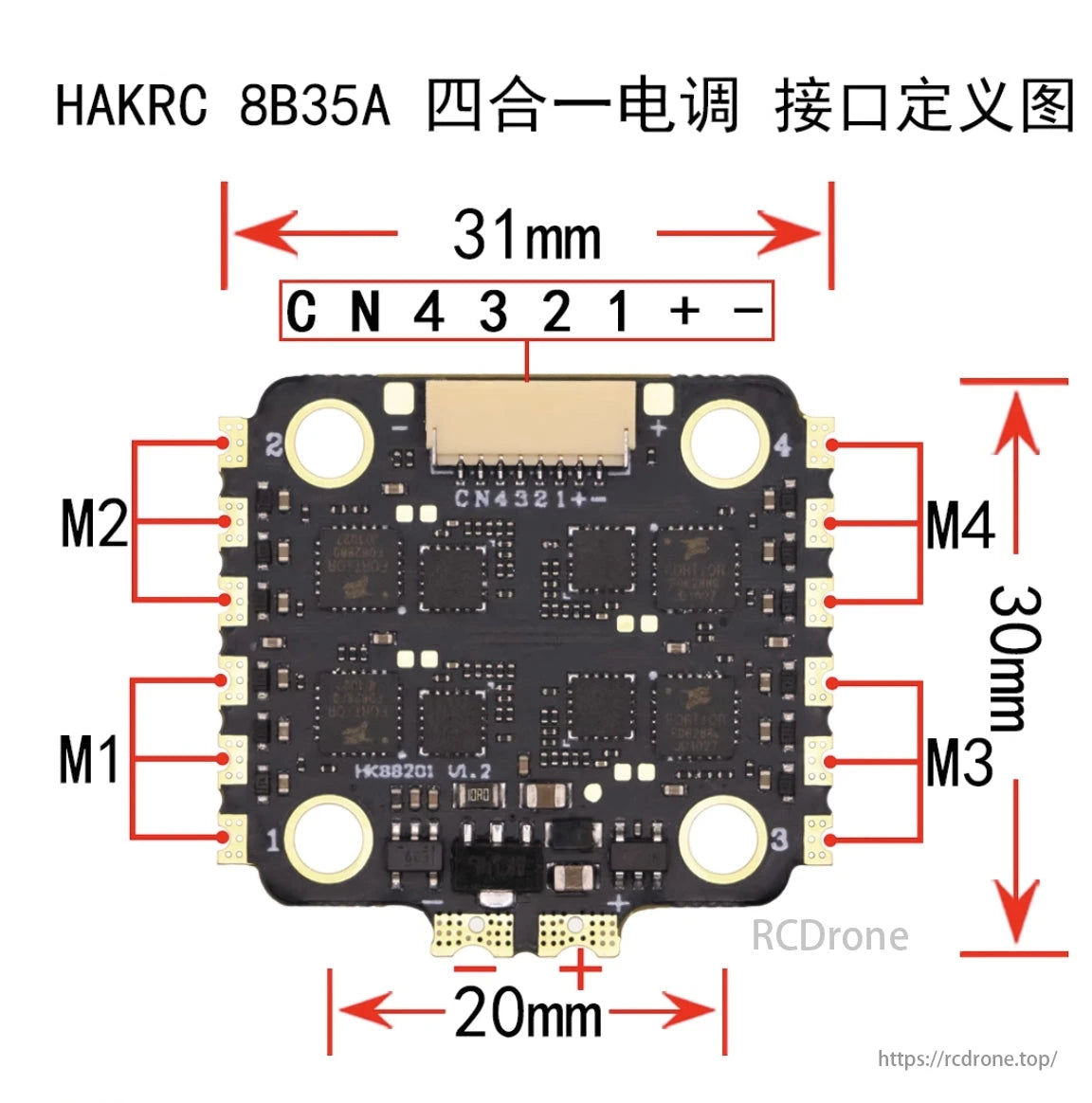 HAKRC 8B35A 4-in-1 ESC interface diagram. Dimensions: 31mm width, 30mm height, 20mm bottom width. M1, M2, M3, M4 labeled.