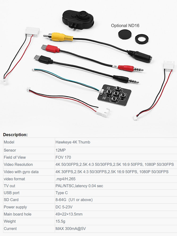 Model Hawkeye 4K Thumb Sensor SONY 12MP Field of View FOV 170 Video Resolution 4K 50/30FPS,2.5K 4.3 50/ 30FPS.2.5K 16.9 50FPS 1080P 50/20FPS Video with gyro data . PALINTSC latency 0.04 sec USB port Type € SD Card 646 (U1 or above) Power supply DC 5-23V Main board hole 49x 22* 13.Smm Weight 15.5g Current MAX 300mA