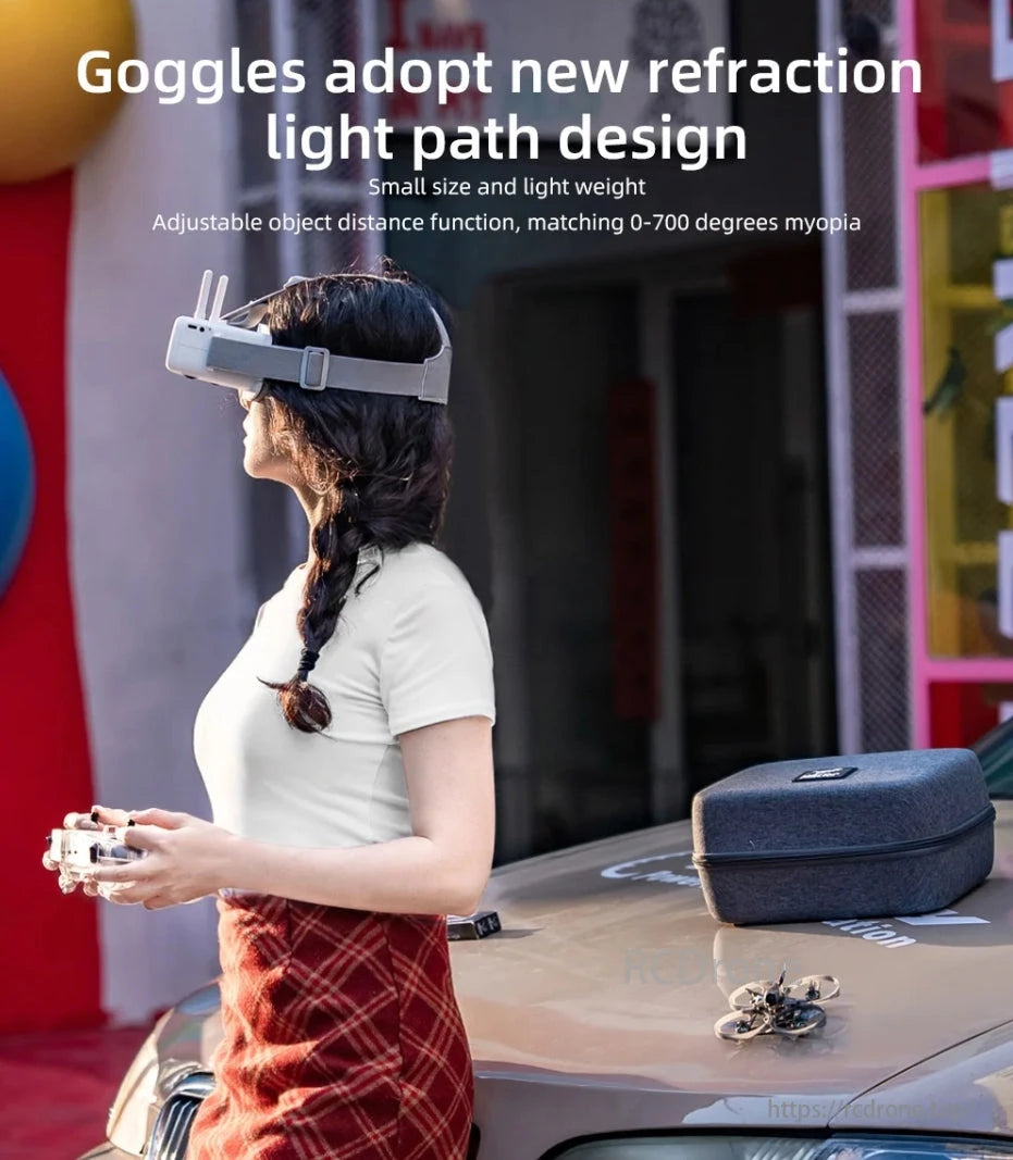 Goggles feature new refraction design, small size, lightweight, adjustable for 0-700 degrees myopia. Woman uses controller outdoors.