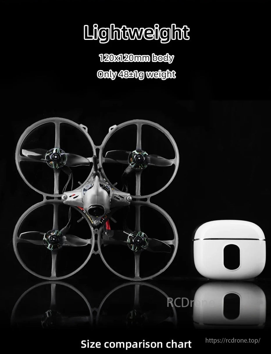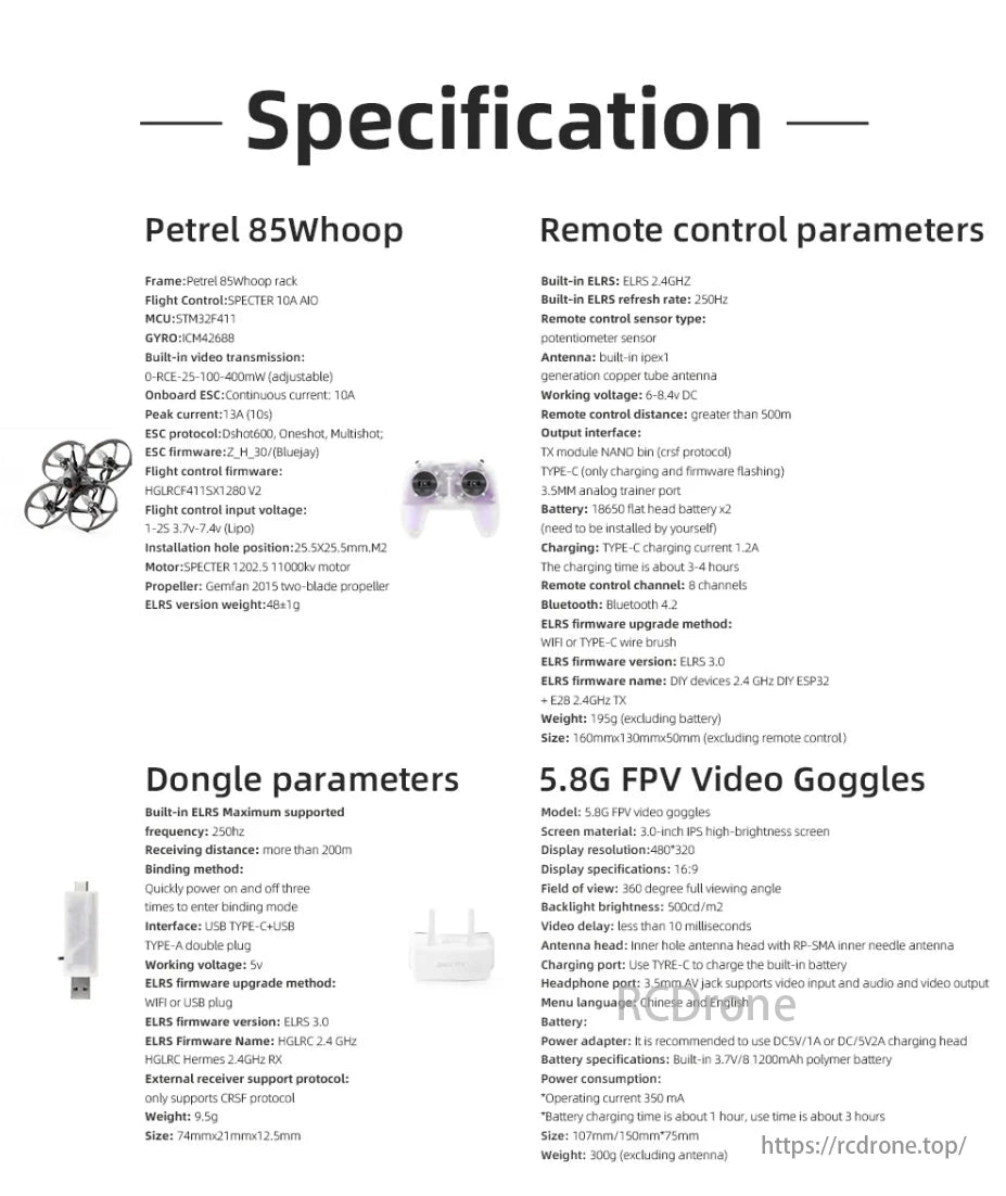 Petrel 85Whoop: 2-inch FPV drone with SPECTER 10A AIO, STM32F411 MCU, ELRS 2.4GHz, 500m+ range. Dongle supports 200m+ distance. 5.8G FPV goggles feature 3-inch IPS screen, 360° view, 10ms delay.