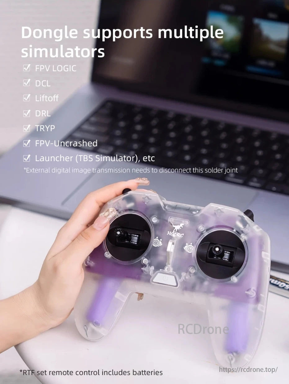 Dongle supports FPV Logic, DCL, Liftoff, DRL, TRYP, FPV-Uncrashed, Launcher (TBS Simulator). RTF set remote control includes batteries.