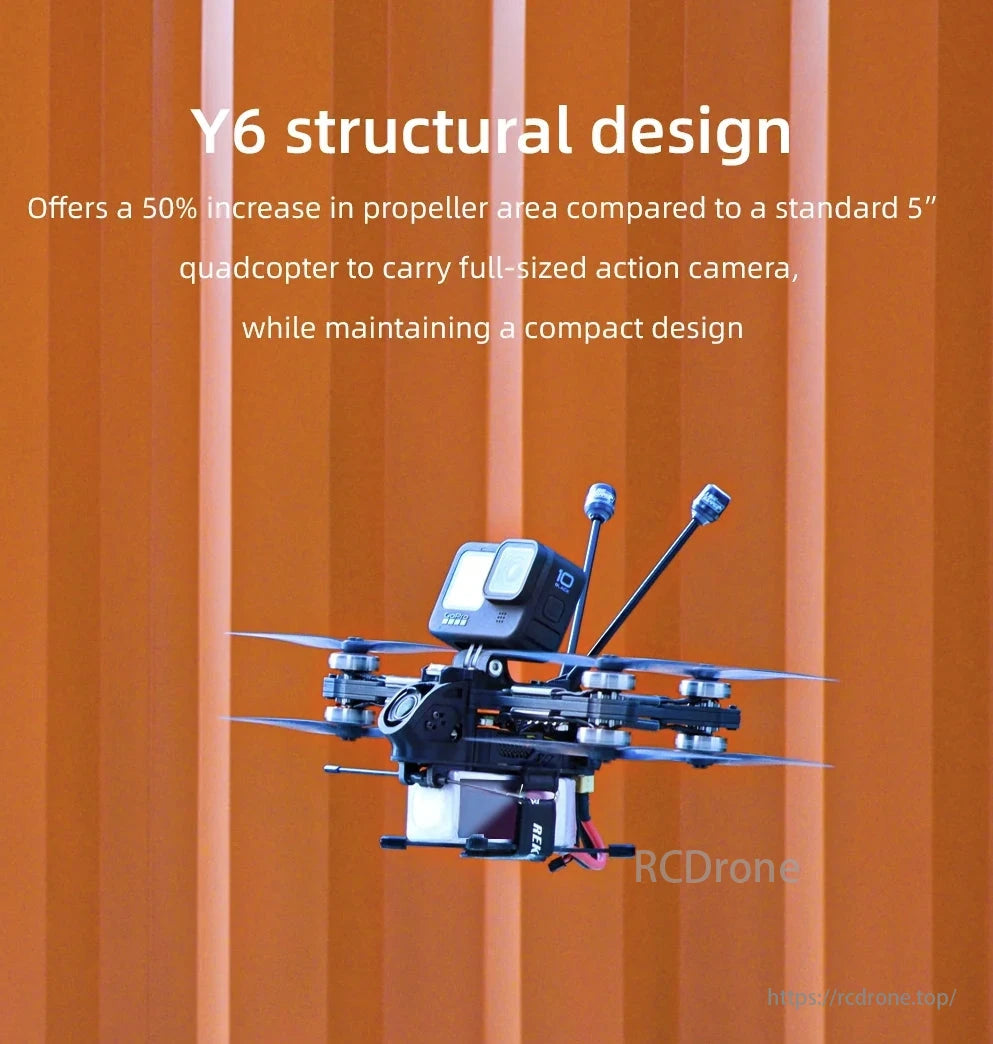 Y6 structural design increases propeller area by 50%, supports full-sized action camera, compact.