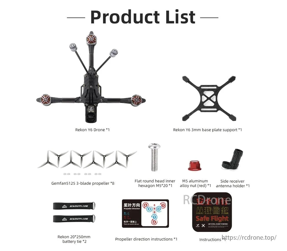 Rekon Y6 Drone components include: Rekon Y6 3mm base plate support, Gemfan5125 3-blade propeller (8 pcs), flat round head inner hexagon M5*20 screw, M5 aluminum alloy nut (red), side receiver antenna holder, Rekon 20*250mm battery tie (2 pcs), propeller direction instructions, and general instructions. All parts are carefully listed for assembling and operating the HGLRC Rekon Y6 6S 5-Inch Long-Range FPV drone. This ensures a smooth setup process with all necessary items accounted for in the product list. Each piece plays a crucial role in functionality and performance.
