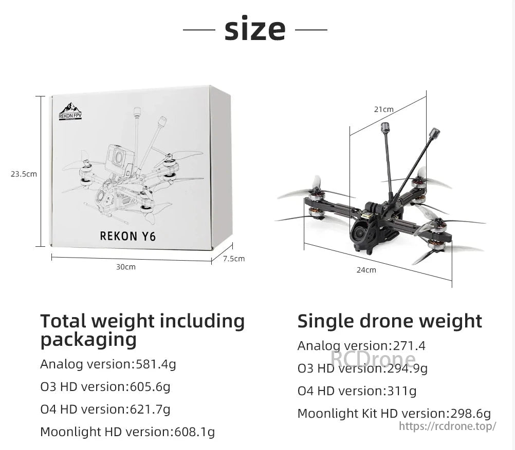 HGLRC Rekon Y6 6S 5-Inch Long-Range FPV. Size: 24x21cm. Packaging: 30x23.5x7.5cm. Total weight (analog): 581.4g, O3 HD: 605.6g, O4 HD: 621.7g, Moonlight HD: 608.1g. Single drone weight varies by version.