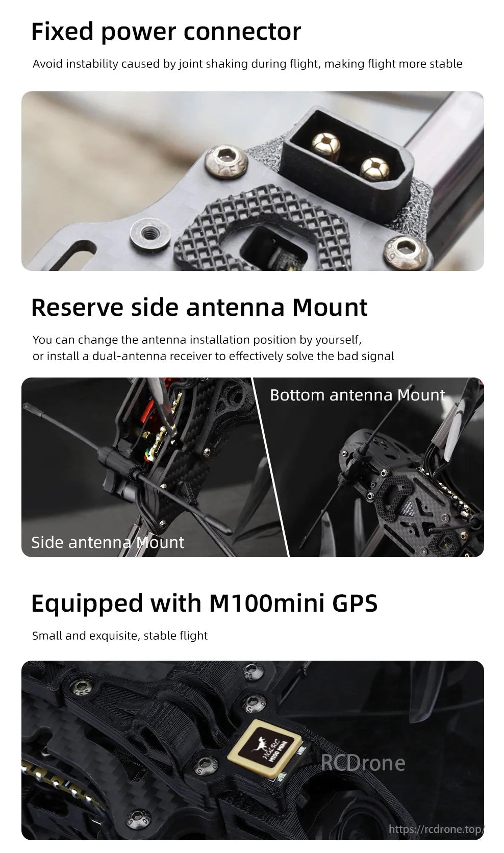 Fixed power connector ensures stability. Reserve antenna mount allows flexible installation. Equipped with M100 mini GPS for stable flight.