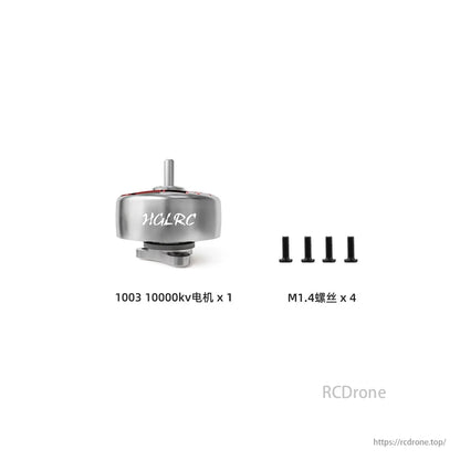 HGLRC Specter 1003 Motor: 10000KV, 11.5A, 85W max power, 2-inch propeller, N52H magnets, Kawasaki1200 stator, 7075 rotor, NMB bearing, 3.35g weight, M1.5x3.8mm output shaft, 1-2S voltage.