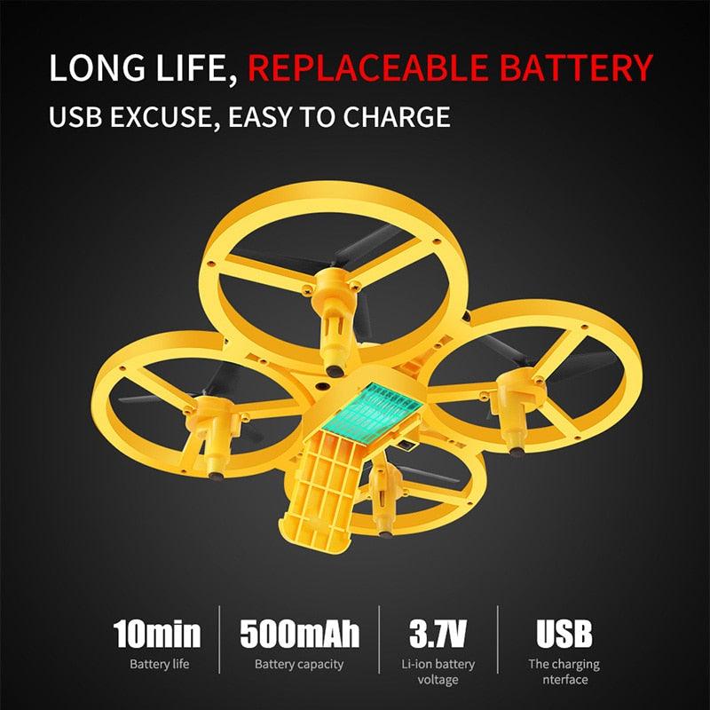 The drone has a replaceable battery with a USB charging port, featuring a 1-hour lifespan using a 500mAh, 3.7V Li-ion battery, which is conveniently located at the bottom of the vehicle.