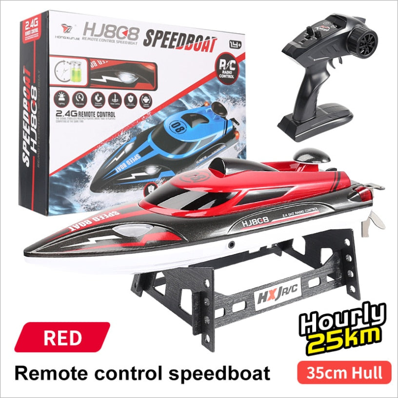 This RC boat features a high-speed, high-performance motor that provides powerful propulsion, reaching speeds of up to 25 kilometers per hour. It's a HJ808 model toy designed for kids.