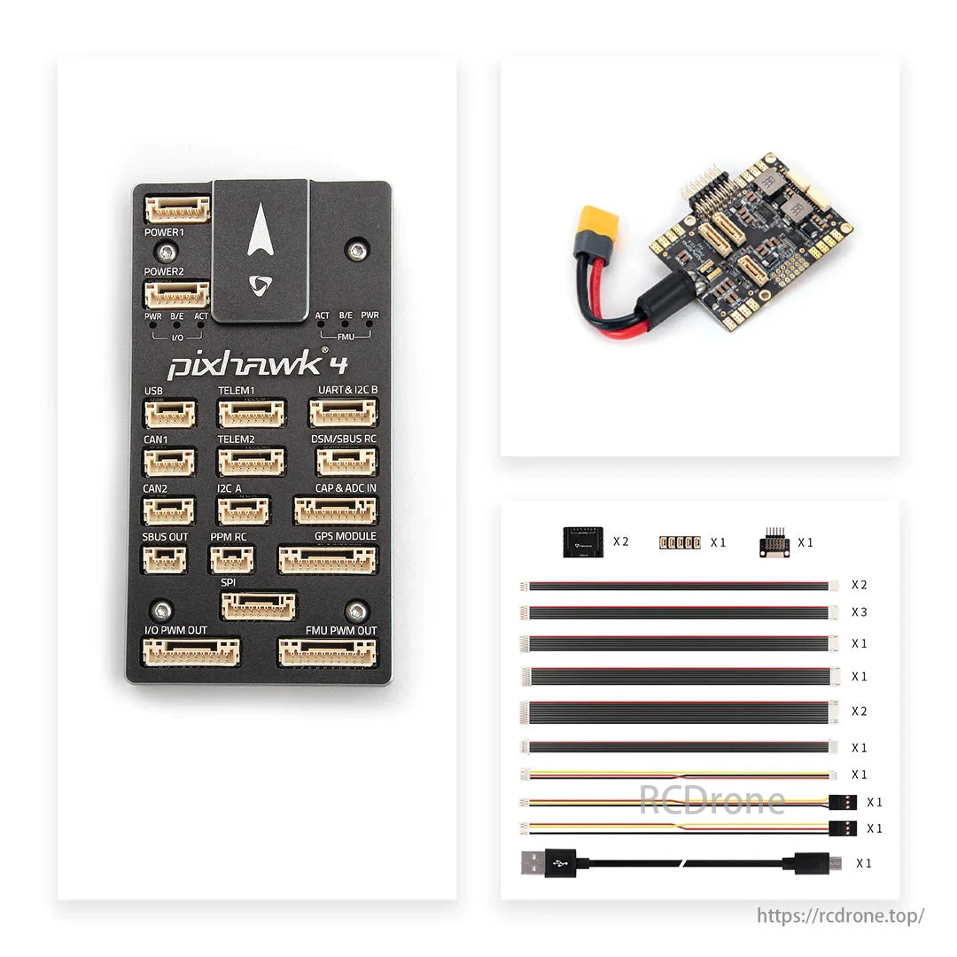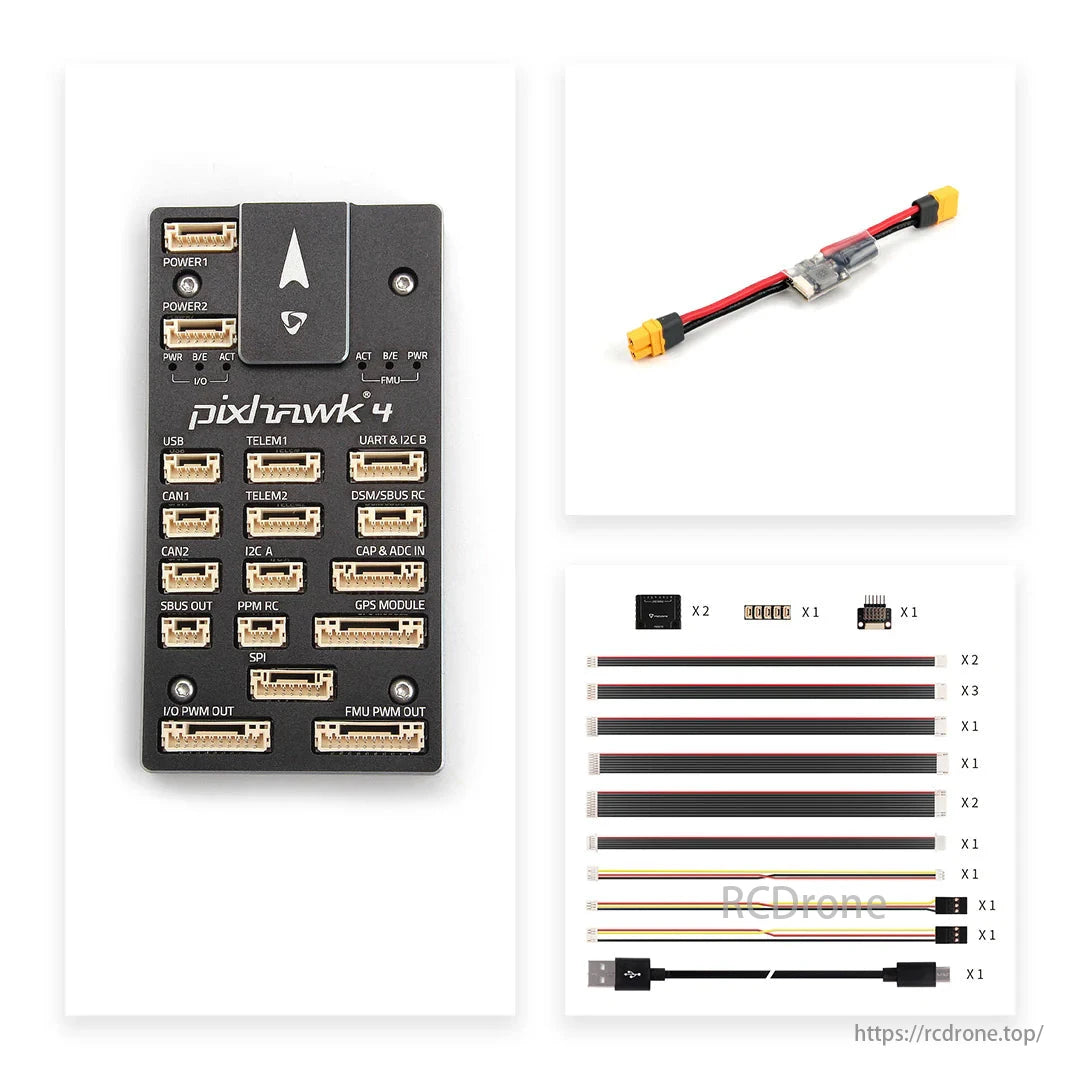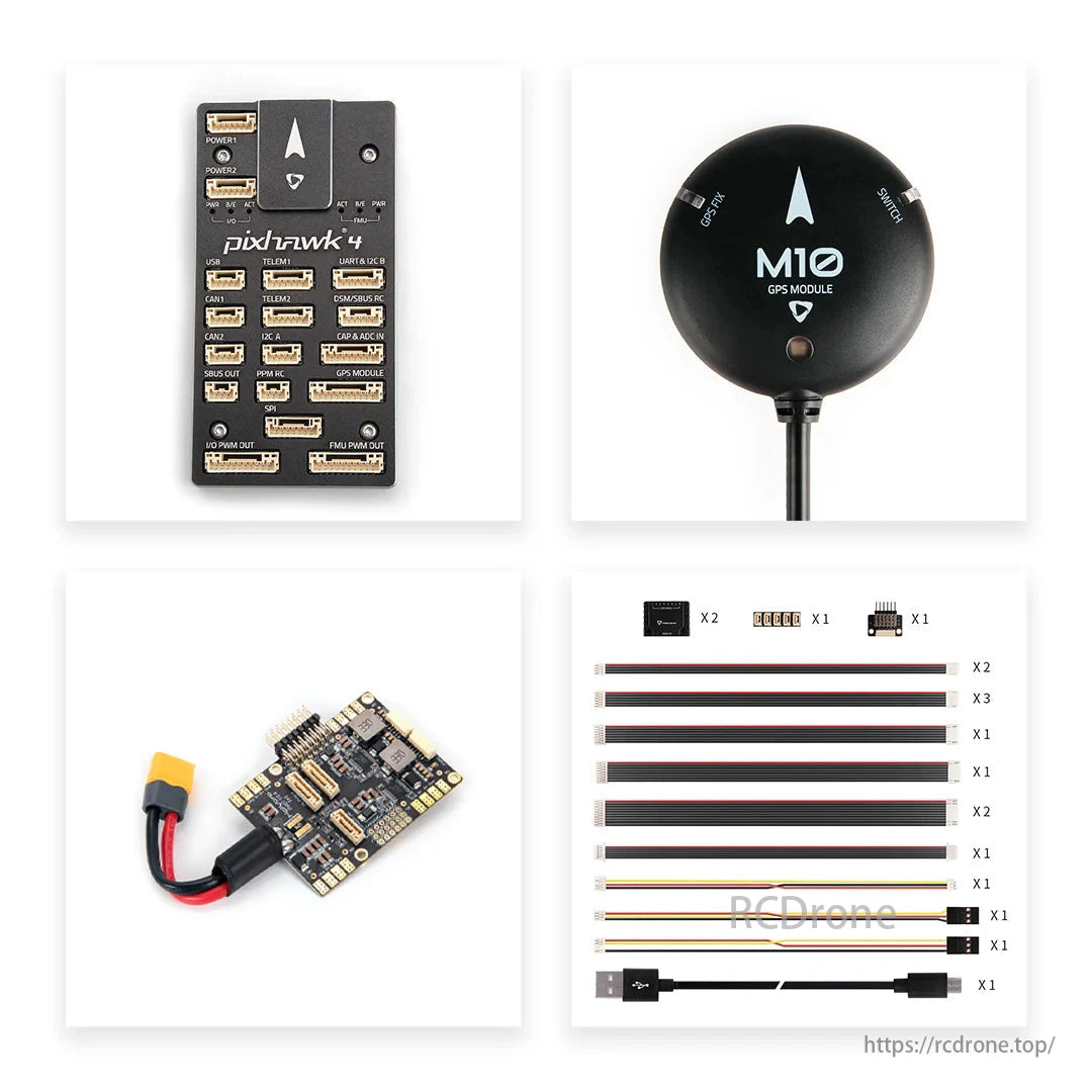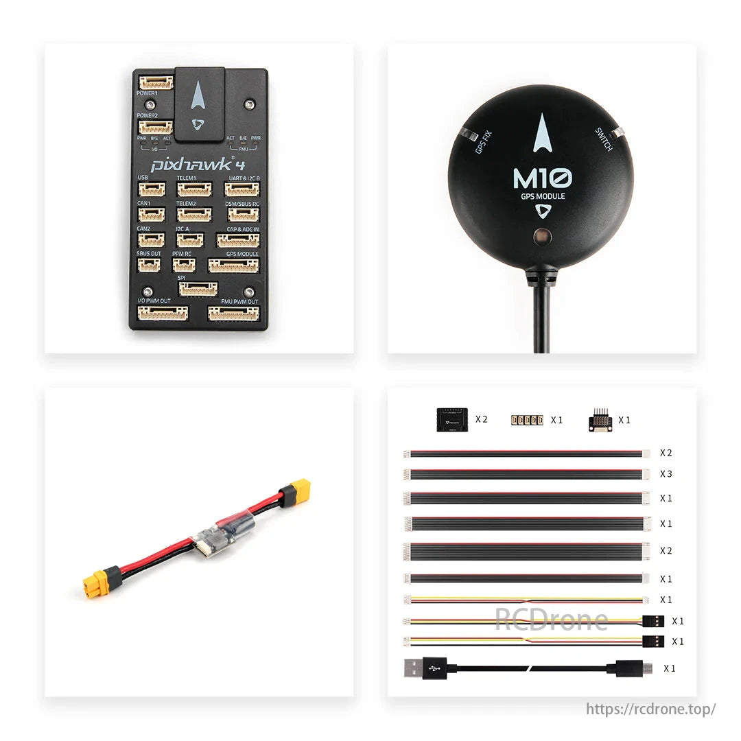 Pixhawk 4 flight controller, M9N GPS module, power module with XT60 connector, and various cables for RC drone assembly.