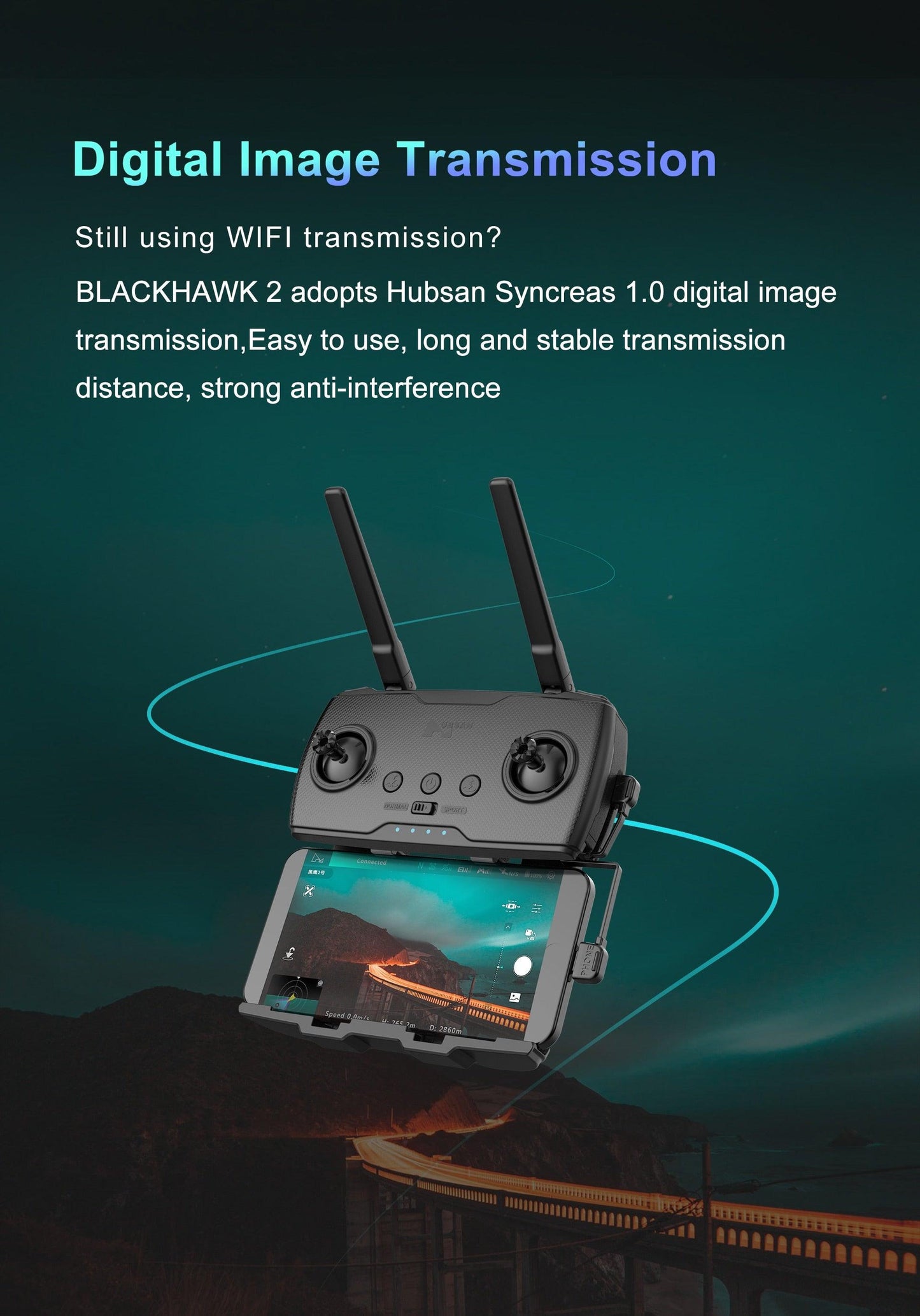 The BLACKHAWK 2 features Hubsan's Syncreas 1.0 digital image transmission technology, which provides strong resistance to interference and ensures a long-range, stable signal transmission.