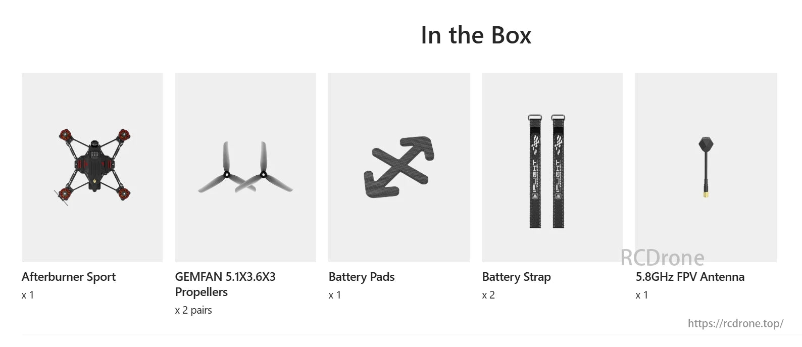Afterburner Sport, GEMFAN 5.1X3.6X3 Propellers (2 pairs), Battery Pads, Battery Strap (2), 5.8GHz FPV Antenna included in box.