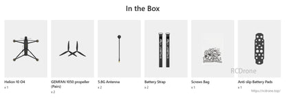 Helion 10 O4, GEMFAN 1050 propellers (2 pairs), 5.8G antennas (2), battery straps (2), screws bag, anti-slip battery pads included in box.