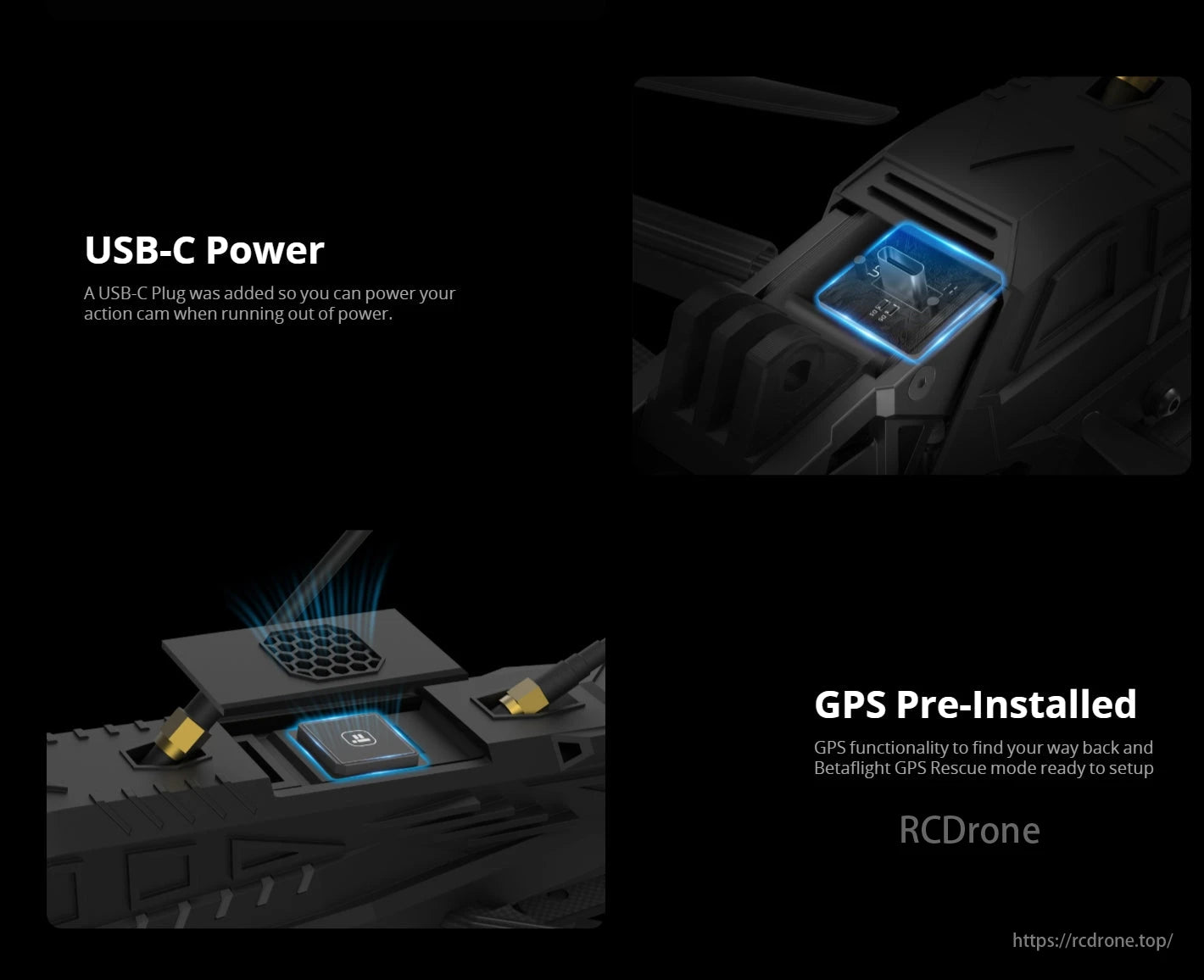 USB-C power for action cam, GPS pre-installed for navigation and Betaflight GPS Rescue setup.