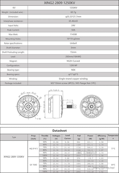 XING2 2809 1250KV motor specs: 60.7g, 35.33x36.7mm, 24V, 50A peak, 1145W max, N52H magnet, NSK bearings, single-strand copper winding. Includes M3 screws and M5 nut. Performance data for HQ 8*4*3 and GF 7040 props at various throttle levels.