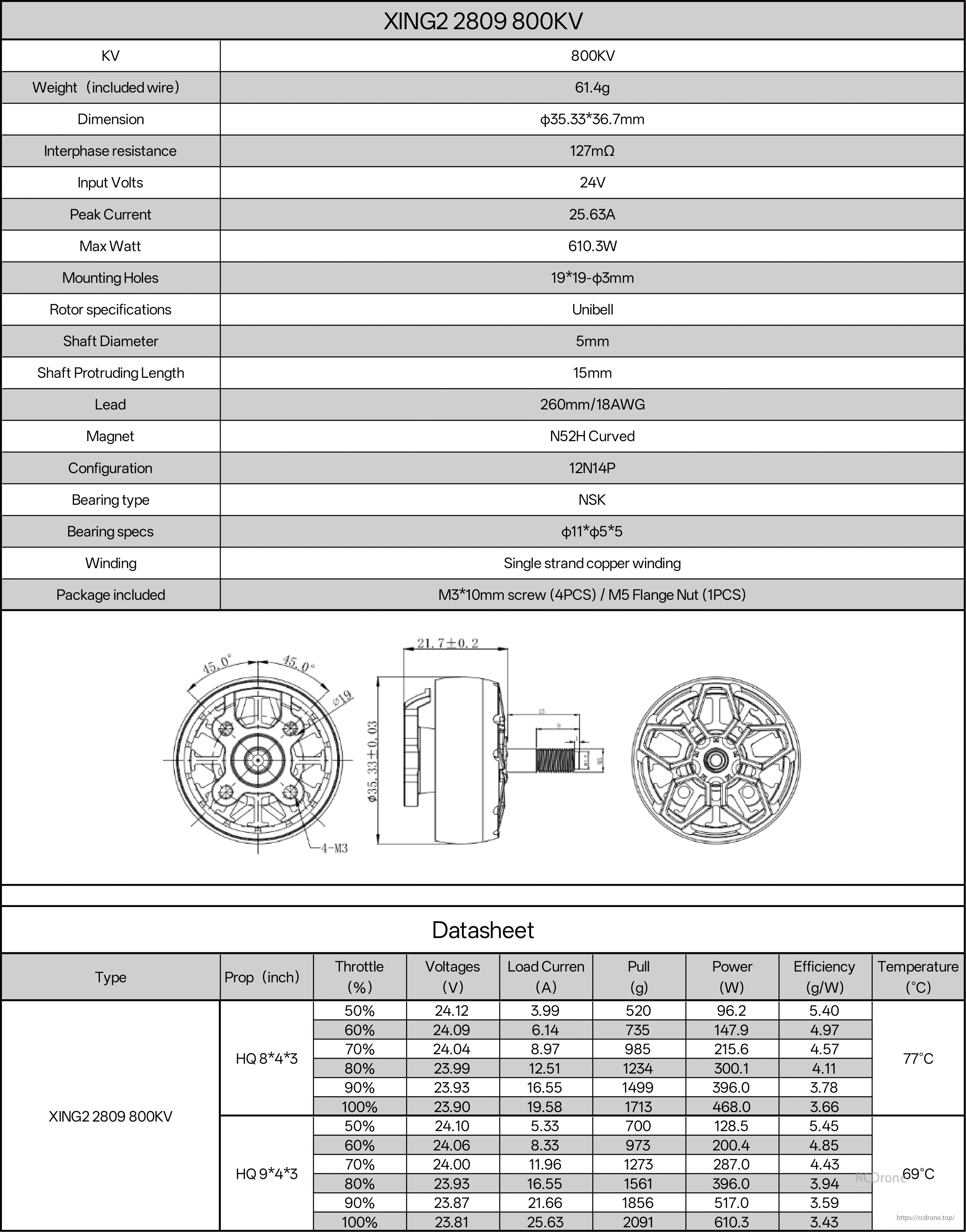 XING2 2809 800KV motor specs: 61.4g, 35.33*36.7mm, 127mΩ, 24V, 25.63A peak, 610.3W max, N52H magnet, 12N14P config, NSK bearings, single strand copper winding. Datasheet includes HQ prop performance at various throttle levels.