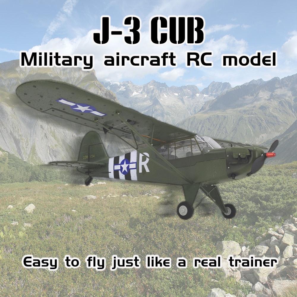 This is a scale model airplane kit, recommended for ages 14+, featuring a WWII military Piper J-3 Cub with intelligent stabilization system. It's a brushless motor RC plane with 2.4G radio control, suitable for indoor flying.