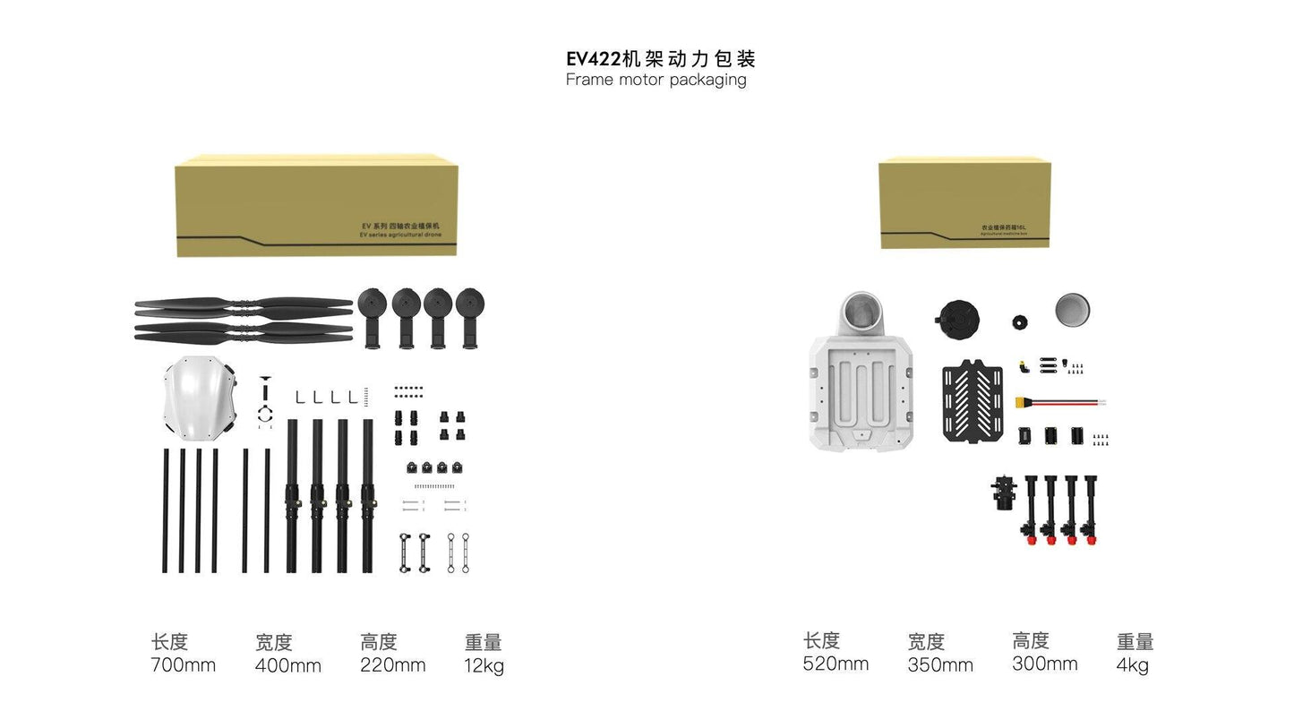 JIS EV422-22L Agriculture Drone: Spraying Pesticides Frame Parts. Includes frame, packaging, and manual. Dimensions: 70cm x 40cm x 22cm (27.5in x 15.7in x 8.6in), weight: 3kg.