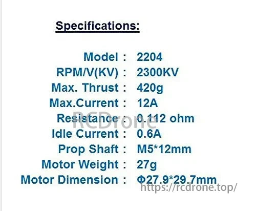 Model 2204, 2300KV, max thrust 420g, 12A current, 0.112 ohm resistance, 0.6A idle, M5*12mm shaft, 27g weight, Φ27.9*29.7mm dimensions.