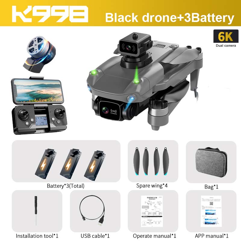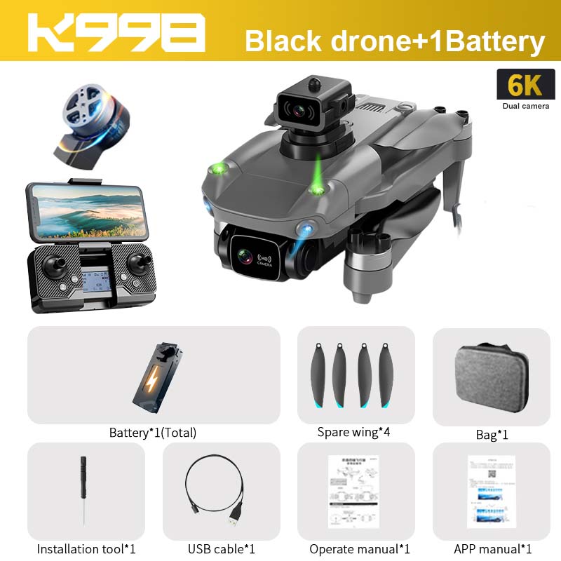 The K998 drone features a durable design made with crash-resistant materials, making it perfect for traveling and storage due to its foldable structure.