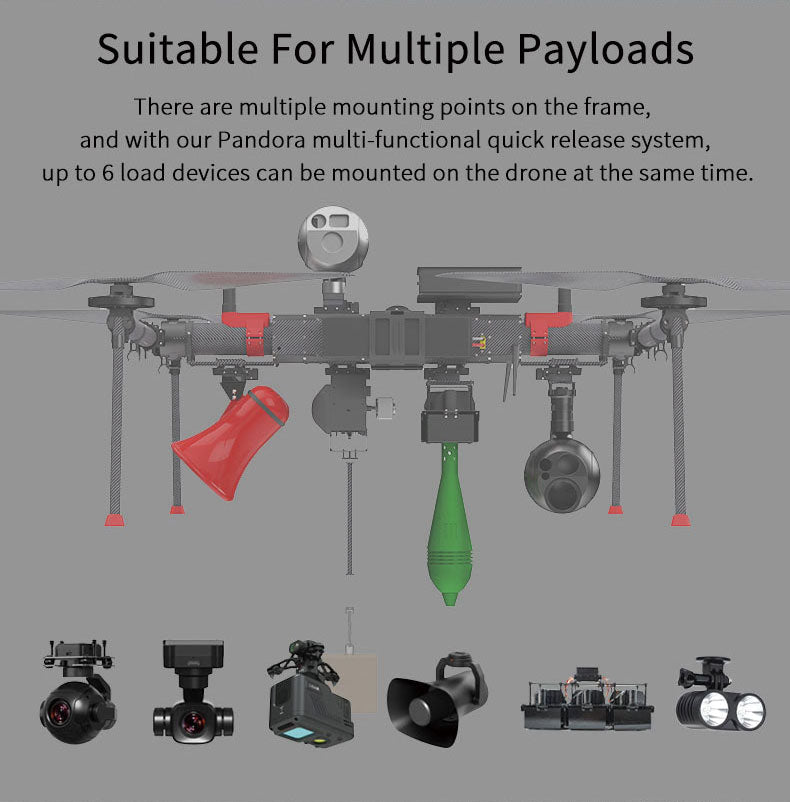 The Pandora Smart Quick Box, crafted from aerospace-grade forged aluminum alloy, supports up to 10KG payloads and ensures durability and performance. This device features a press-fit modular design allowing for quick assembly and disassembly in just 2 seconds, enhancing operational efficiency without the need to dismantle the drone's body.