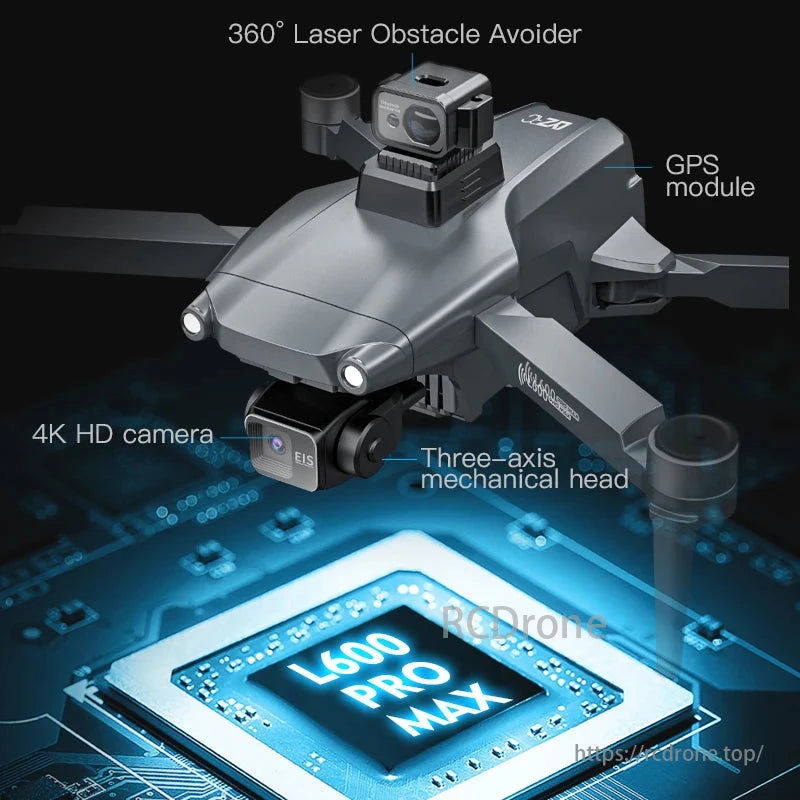 L600 Pro Max integrates 360° laser obstacle avoidance, GPS, 4K HD camera, and a three-axis mechanical head for powerful performance.