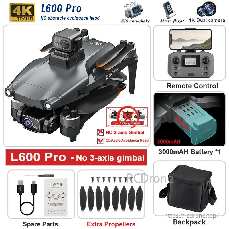 L600 PRO MAX GPS Drone, L600 PRO MAX drone offers 28-min flight, 3km range, 4K camera, 360° obstacle avoidance, folding design, dual cameras, GPS follow, gesture control, and more. Battery: 7.4V 4500mAh.